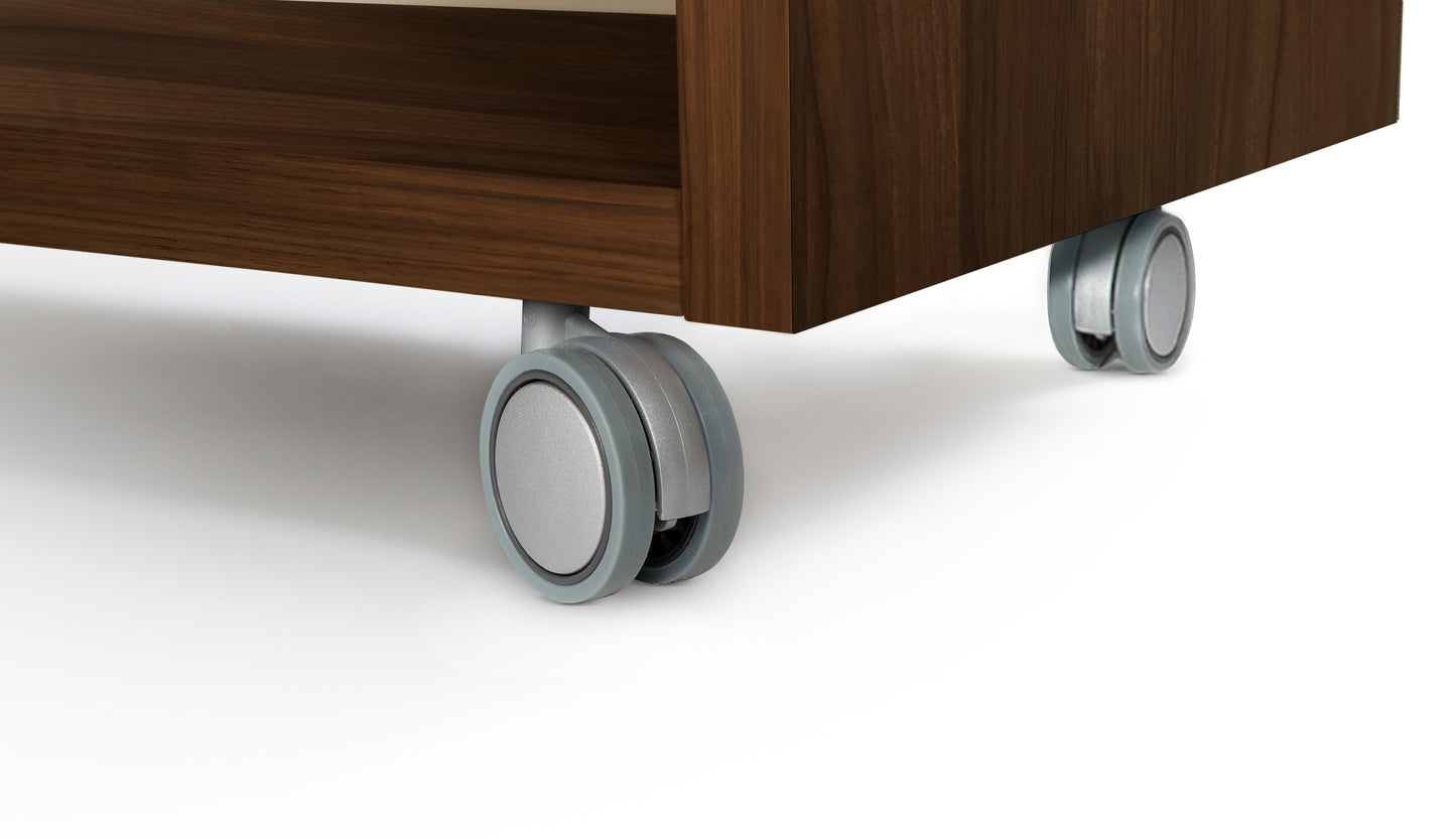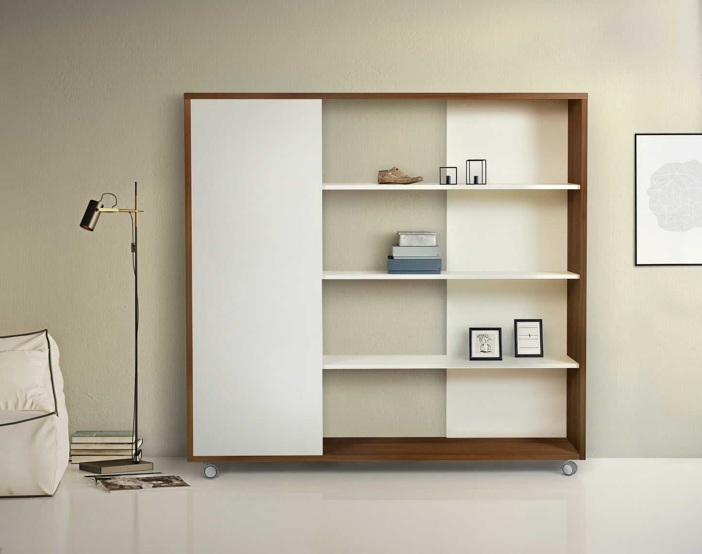 Wide bookcase/room divider with three fixed shelves. On the left side (front and back) there is a vertical section, which partially (48cm) covers the shelves. The outer parts are made of walnut veneered chipboard (PLP23). The shelves (28.5x145.5 cm) and the vertical partitions are made of white melamine chipboard (MFC16). Four wheels (h8cm) make this bookcase easy to move.