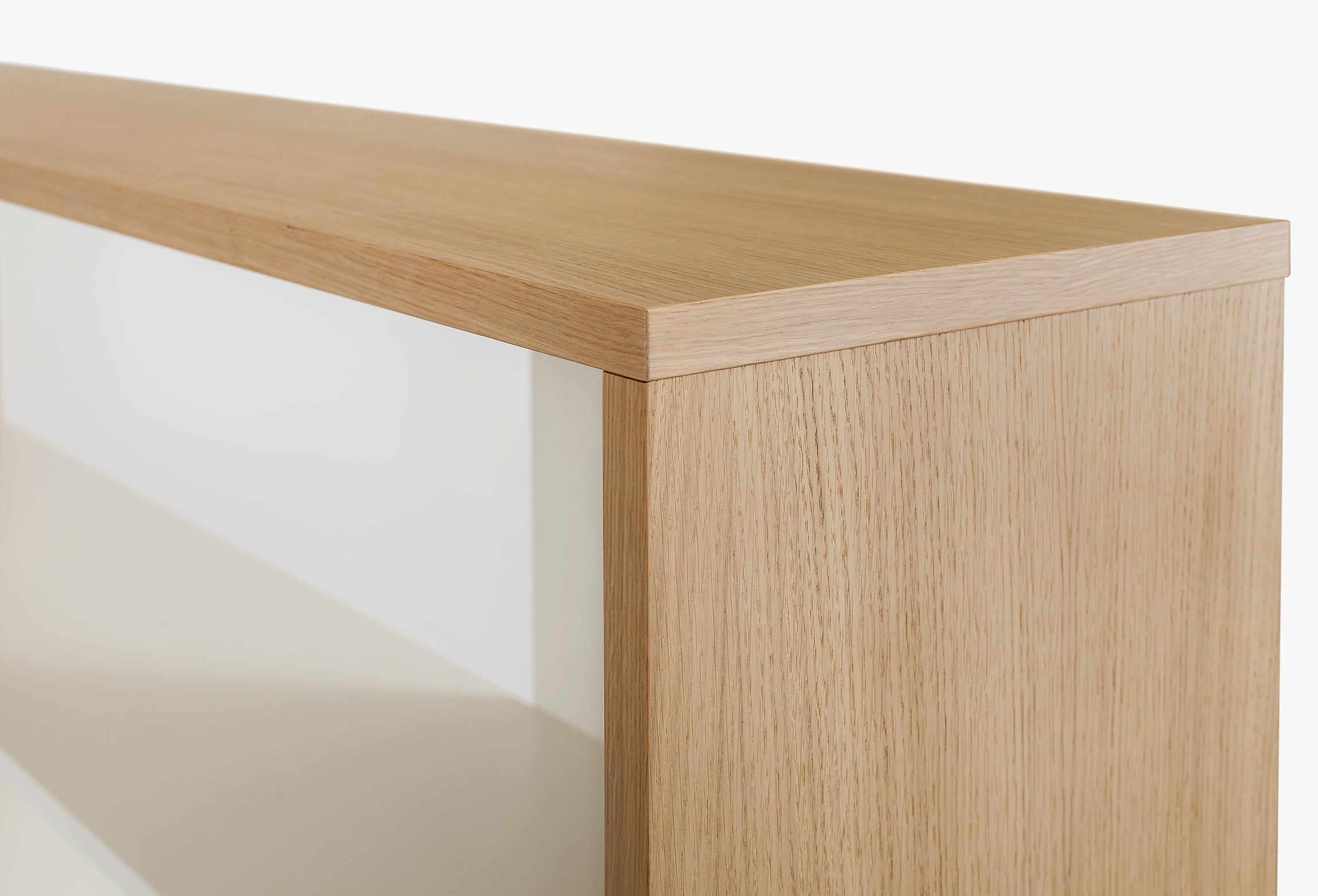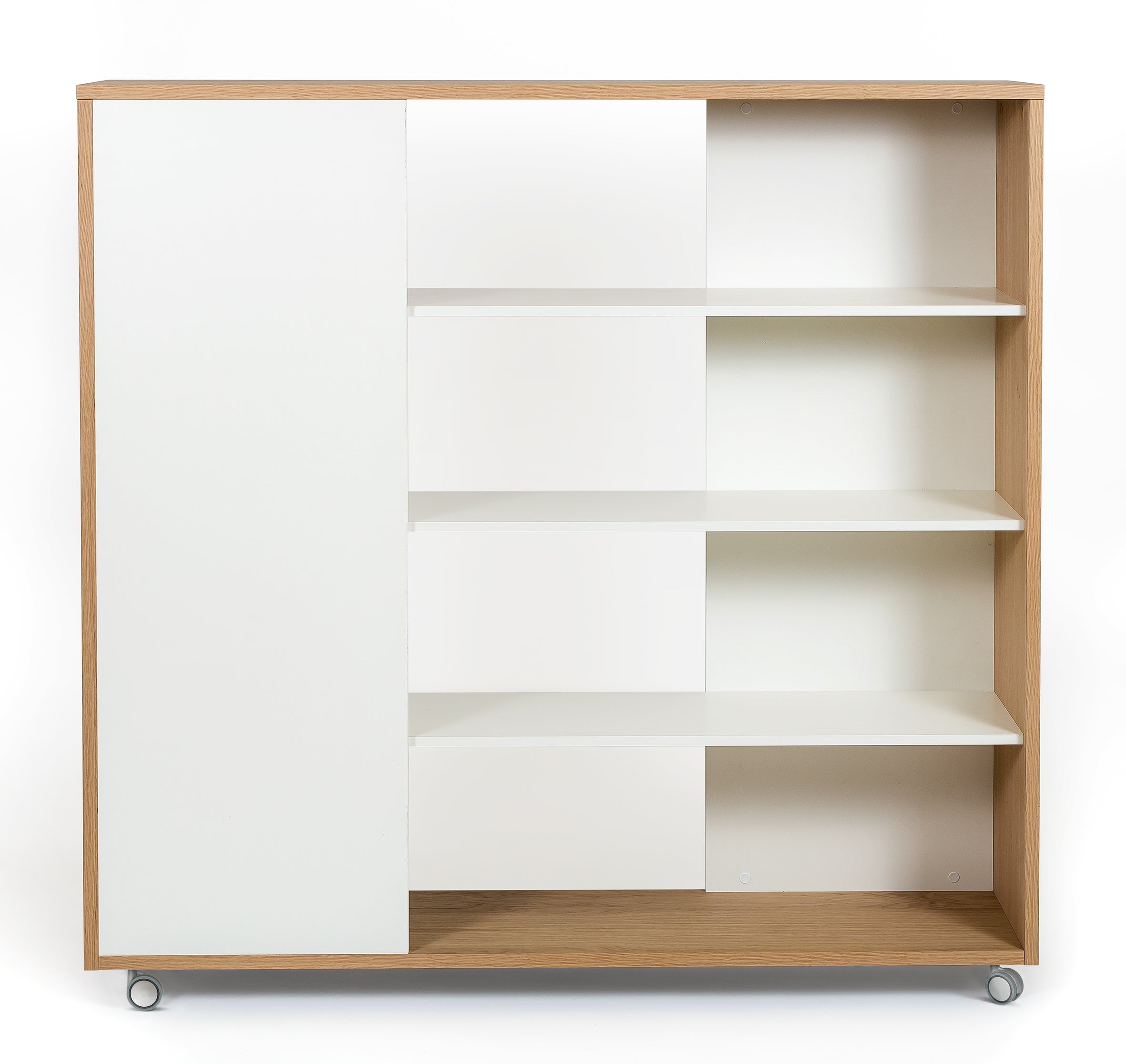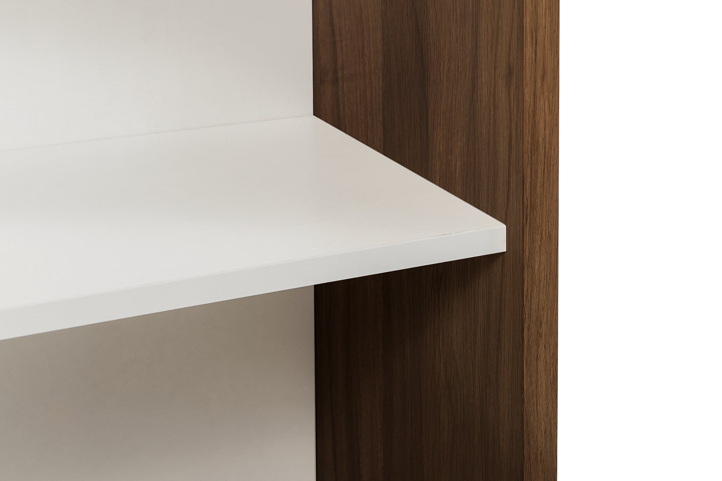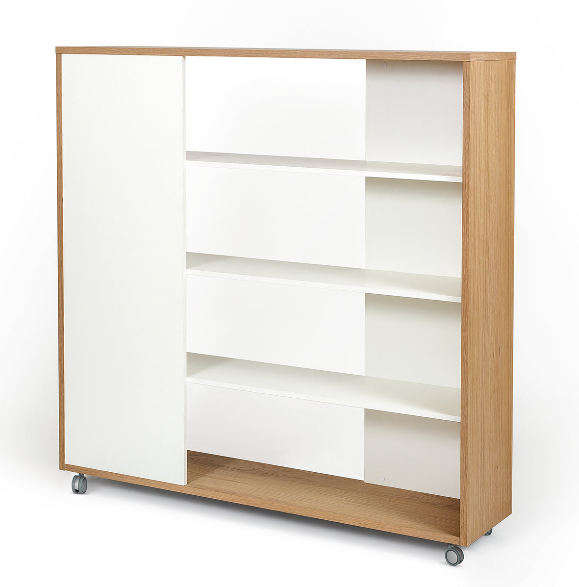 Wide bookcase/room divider with three fixed shelves. On the left side (front and back) there is a vertical section, which partially (48cm) covers the shelves. The outer parts are made of walnut veneered chipboard (PLP23). The shelves (28.5x145.5 cm) and the vertical partitions are made of white melamine chipboard (MFC16). Four wheels (h8cm) make this bookcase easy to move.
