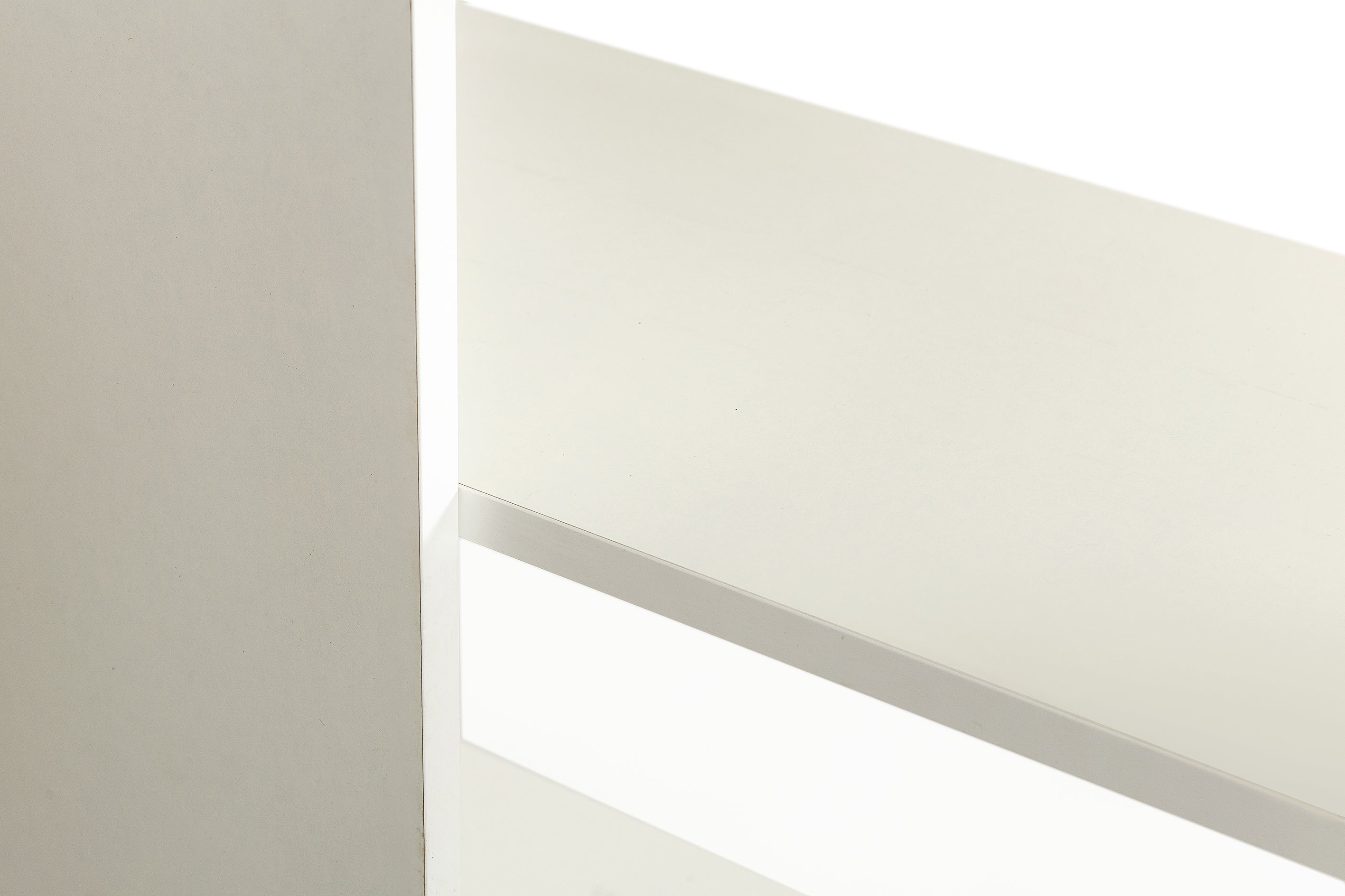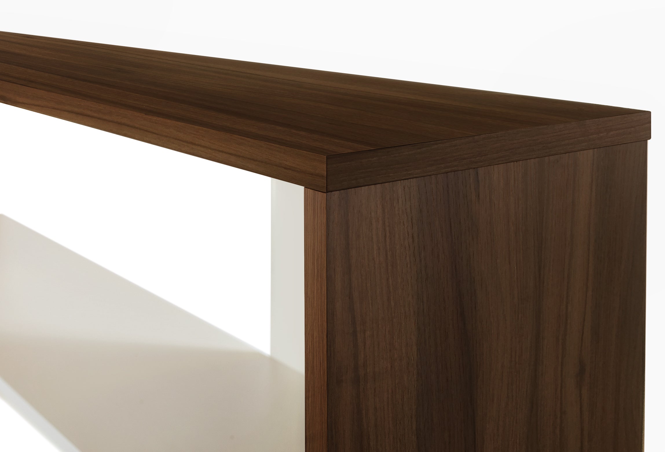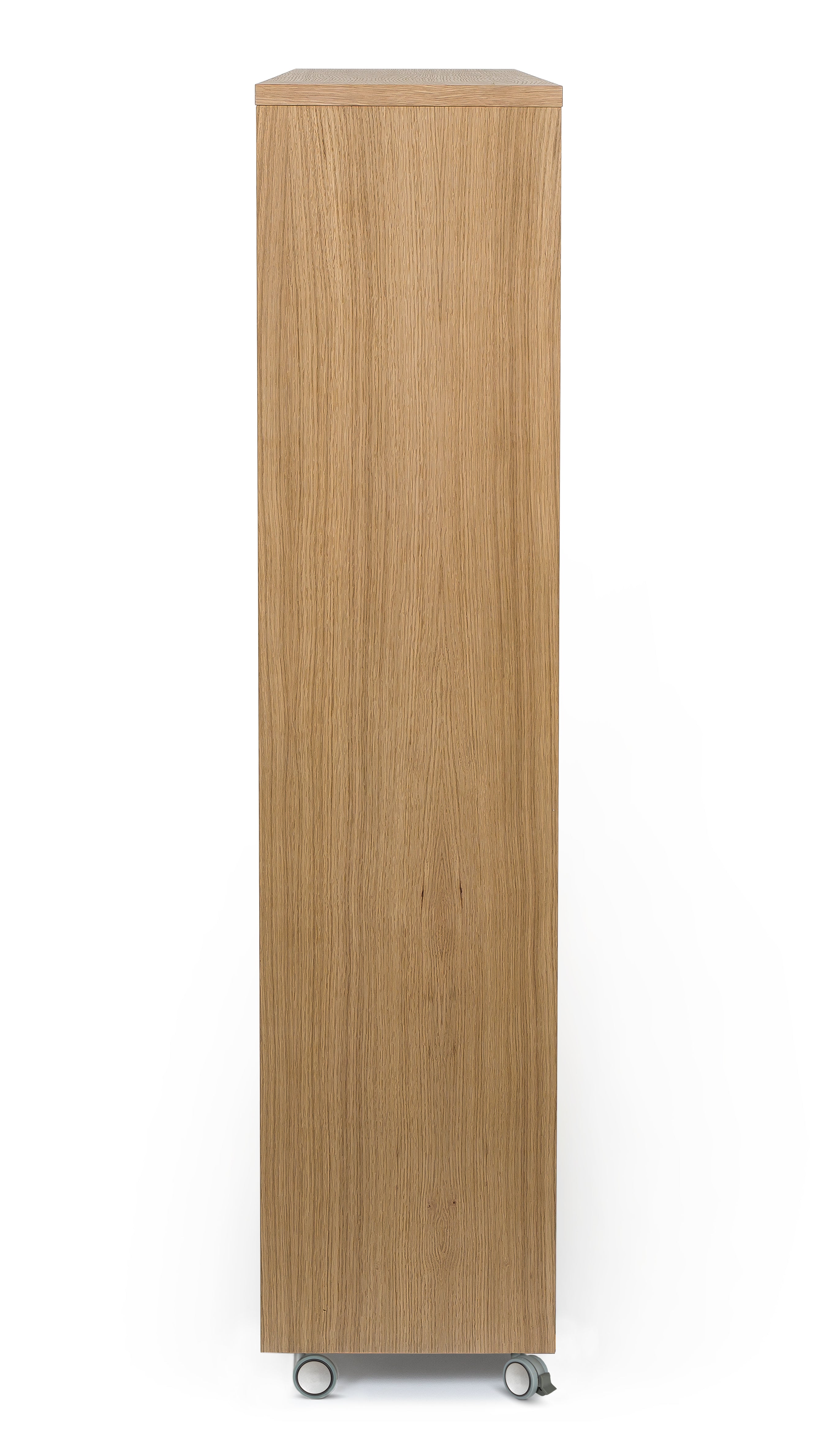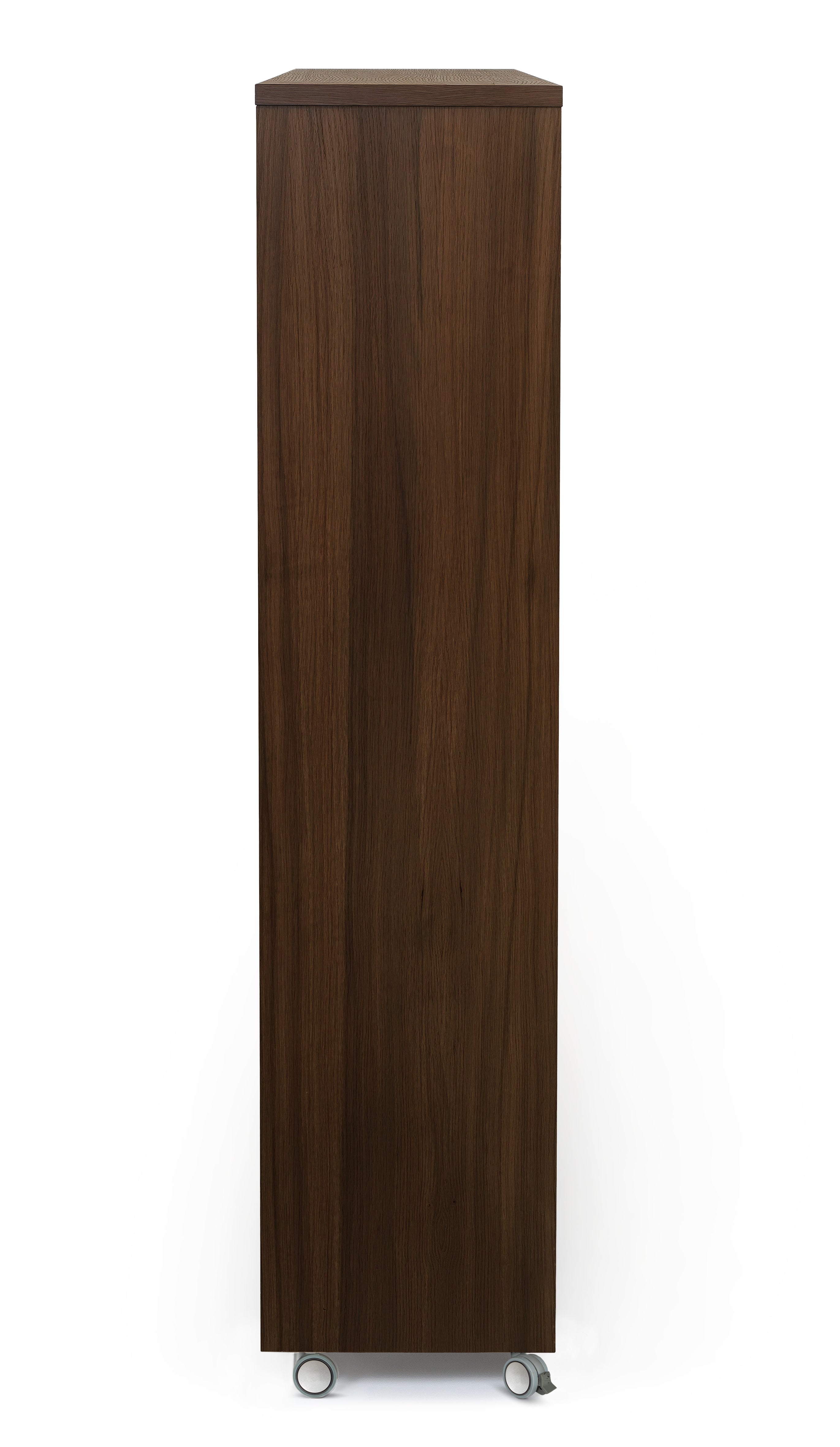 Wide bookcase/room divider with three fixed shelves. On the left side (front and back) there is a vertical section, which partially (48cm) covers the shelves. The outer parts are made of walnut veneered chipboard (PLP23). The shelves (28.5x145.5 cm) and the vertical partitions are made of white melamine chipboard (MFC16). Four wheels (h8cm) make this bookcase easy to move.