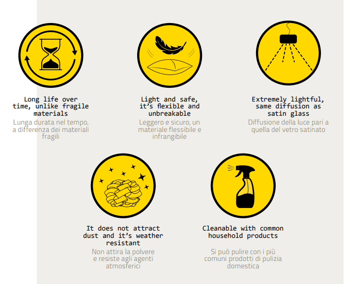 Material: Polilux™ An innovative Italian material that is easy to clean, repels dust and is not brittle. Non-toxic and durable.