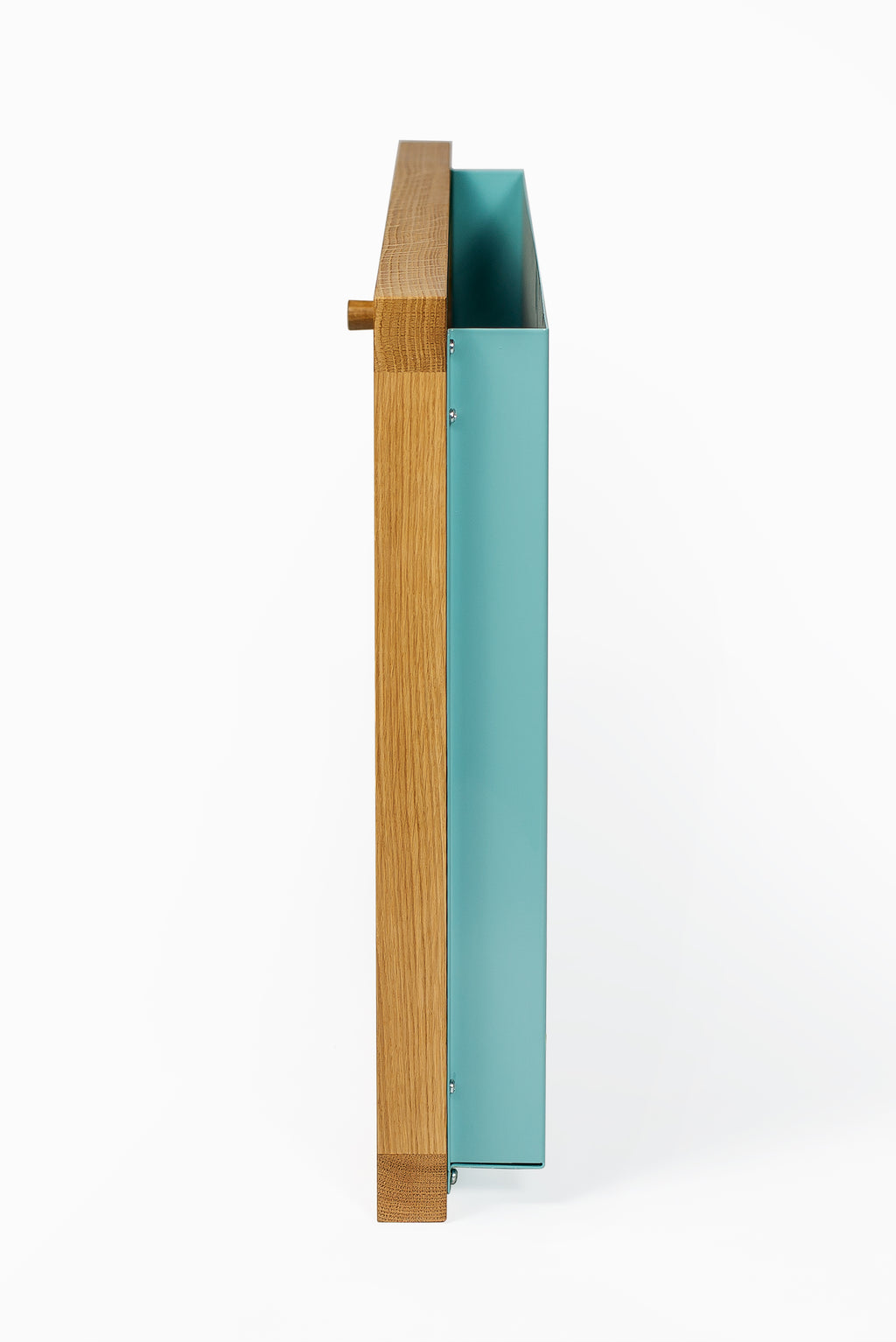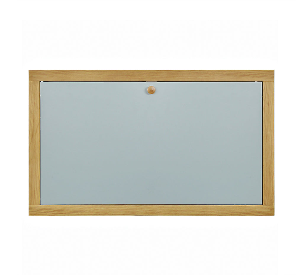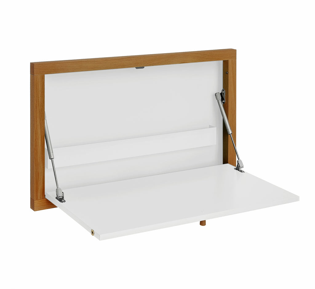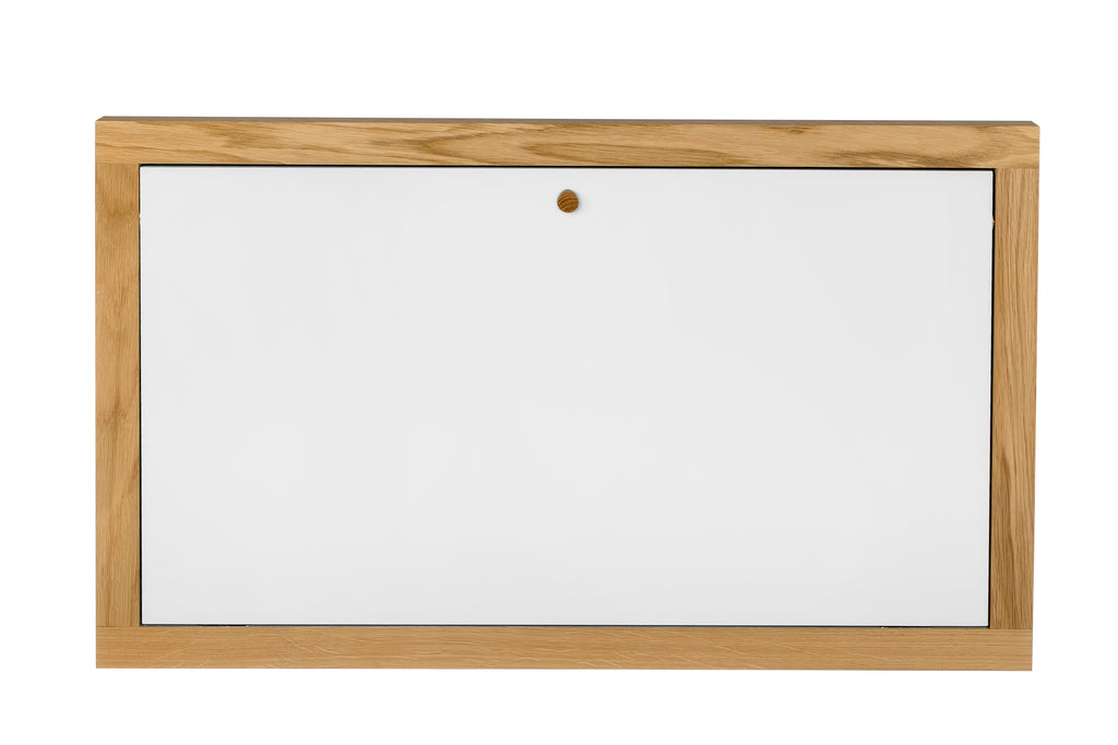 Wall-mounted desk, metal box in solid oak frame, painted door. A practical solution for any space that requires a workspace but we don't want it to take up space permanently. Elegant and sturdy solution.