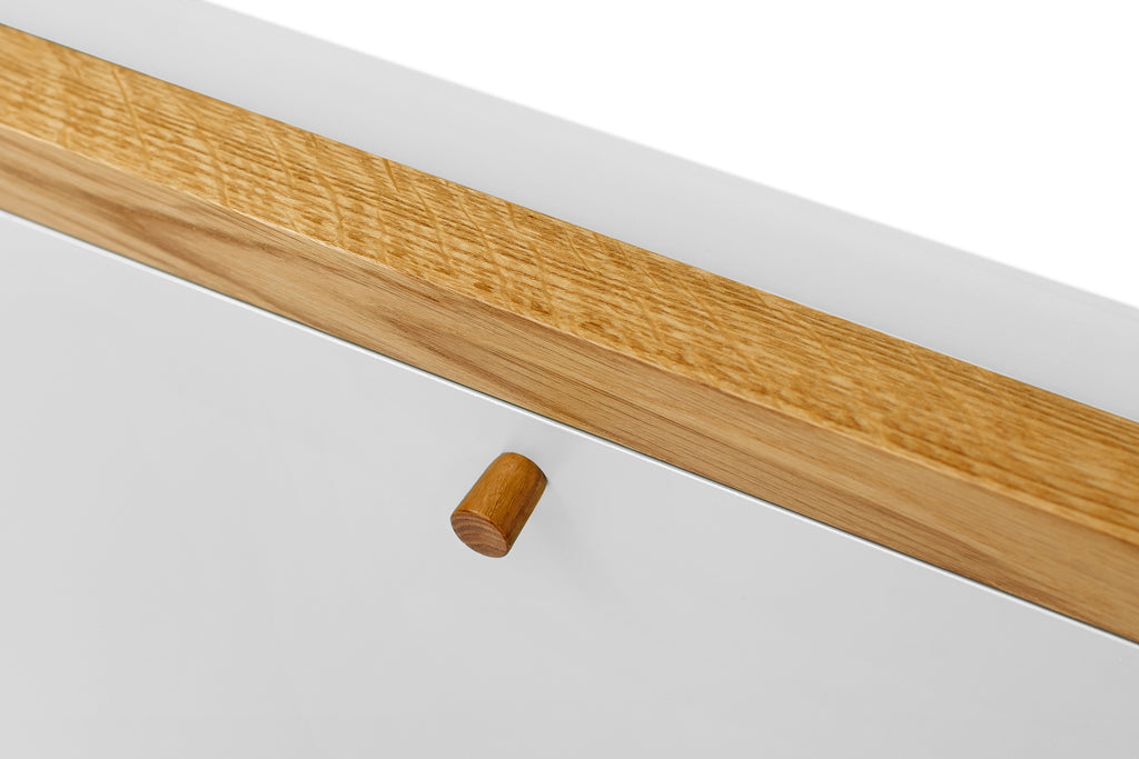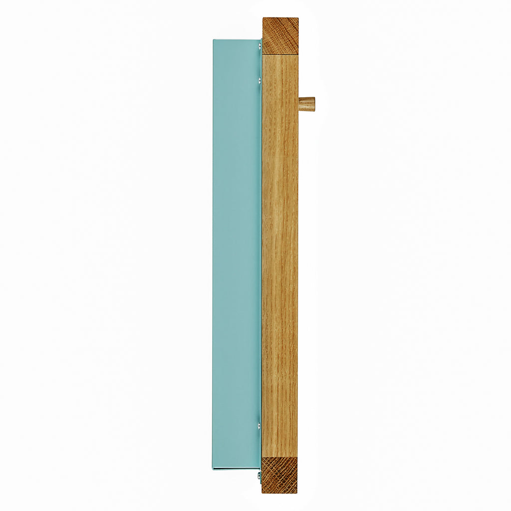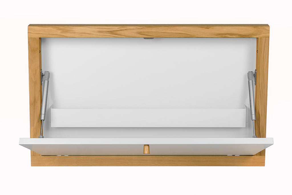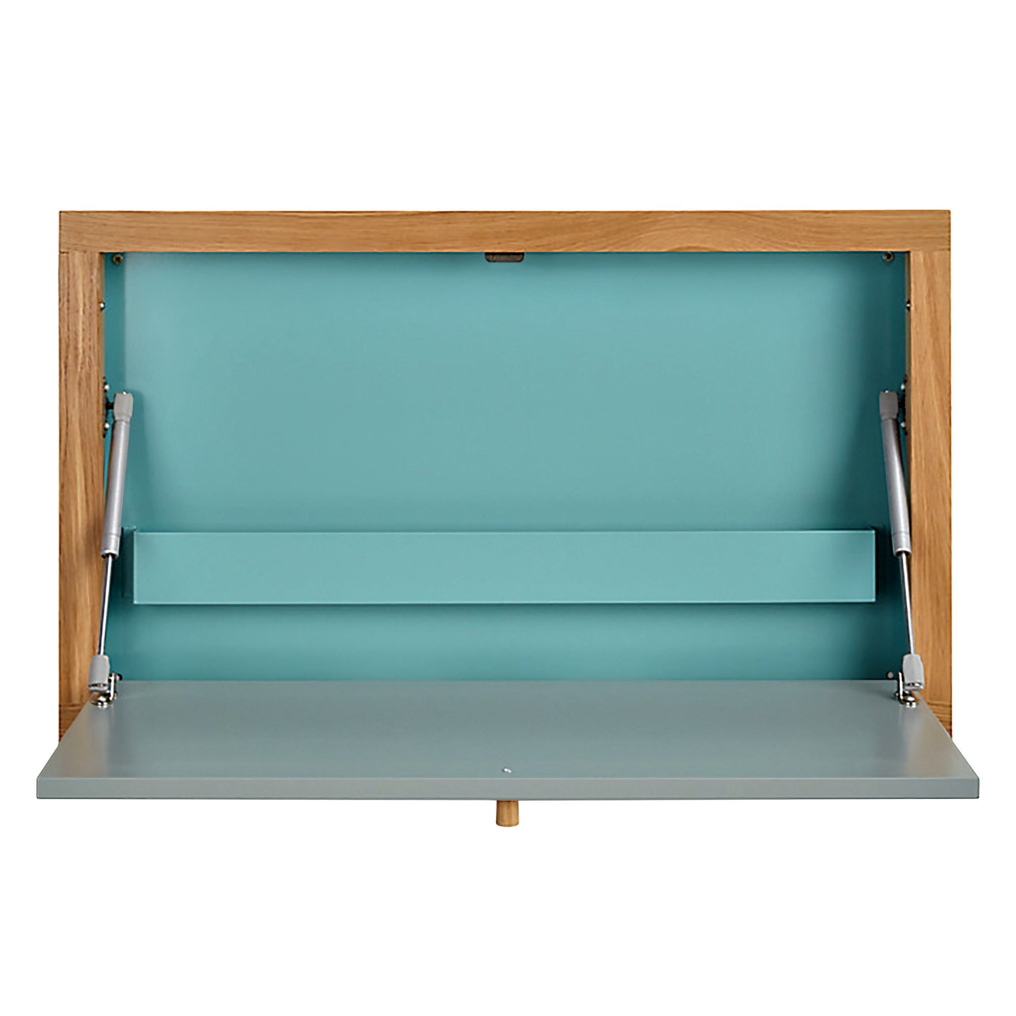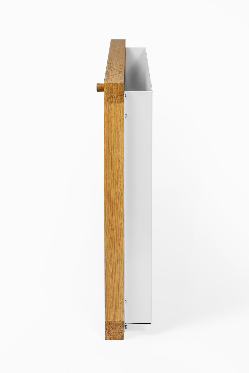 Wall-mounted desk, metal box in solid oak frame, painted door. A practical solution for any space that requires a workspace but we don't want it to take up space permanently. Elegant and sturdy solution.