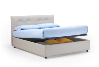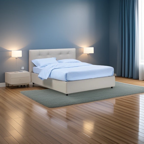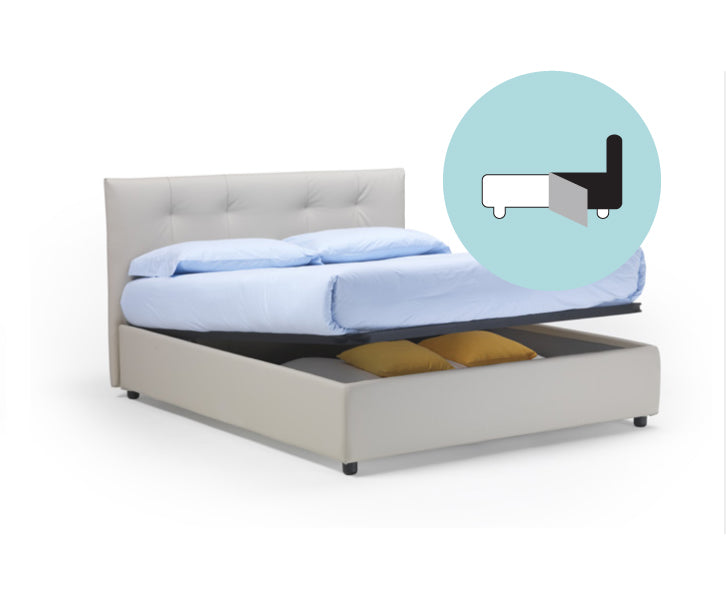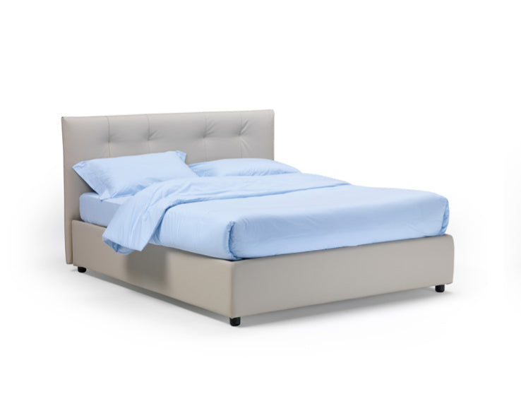 Classic, simple Italian upholstered bed. Soft headboard with 4 quilted seams. Non-removable cover. Available in a variety of eco-leather fabrics. The price includes a stand with storage space.