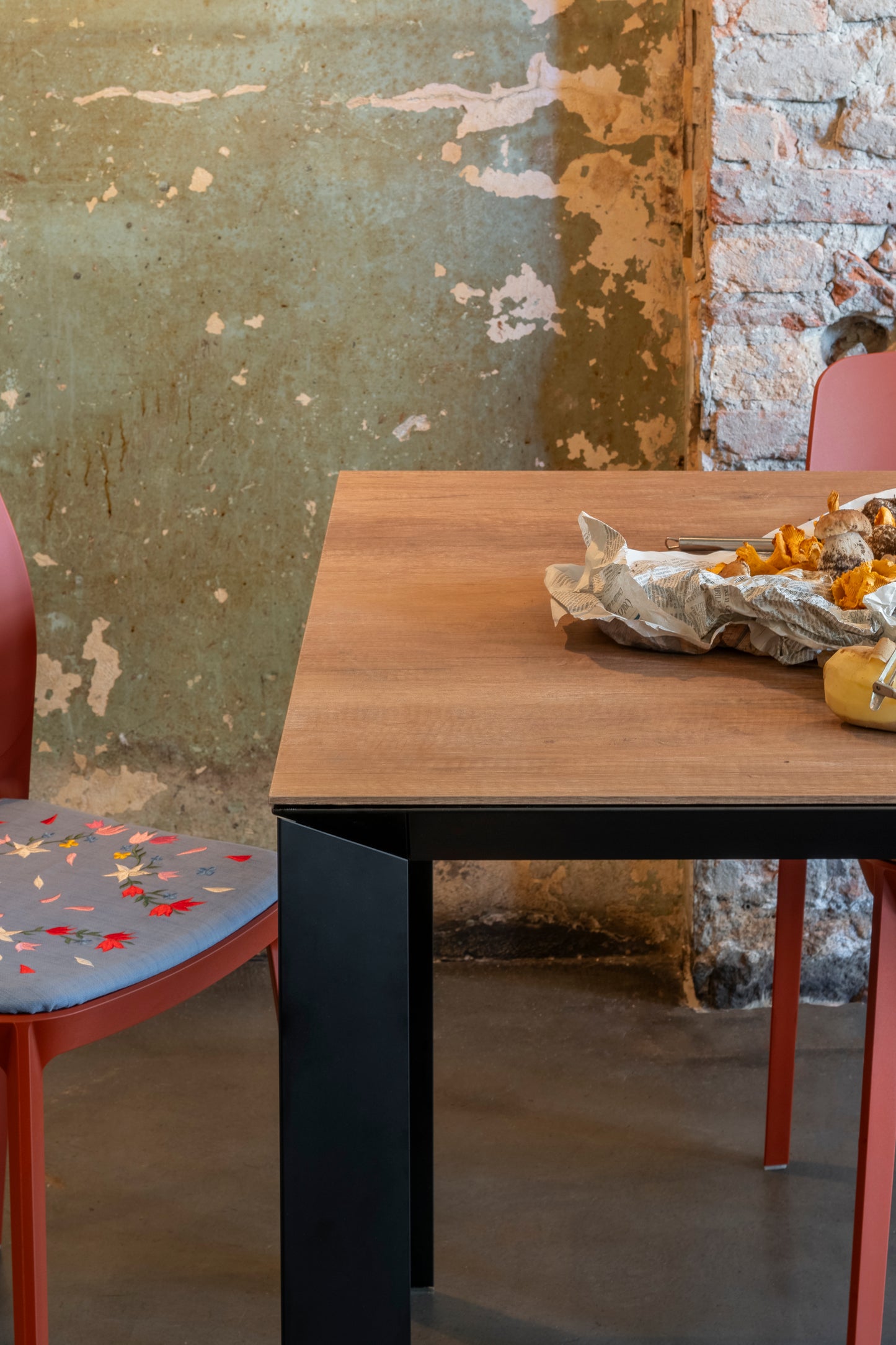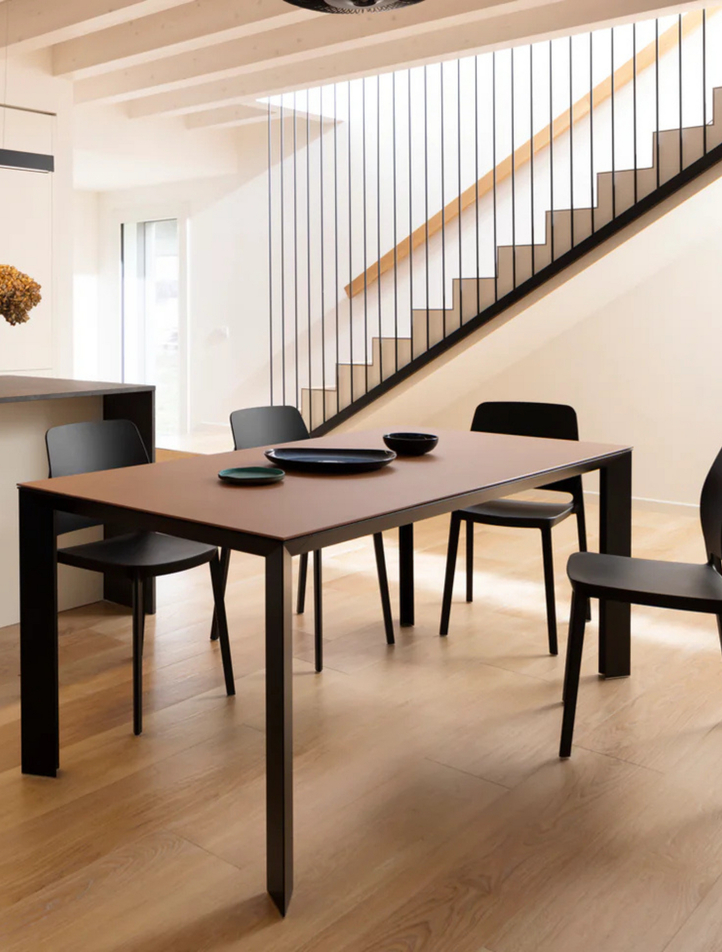 The design of the legs is the true signature of the Diamante table. It is reminiscent of the silhouette of a cut diamond, with a fascinating visual effect: the thin lines capture the light in a unique way, creating plays of shadows that add a touch of dynamism to the entire space.