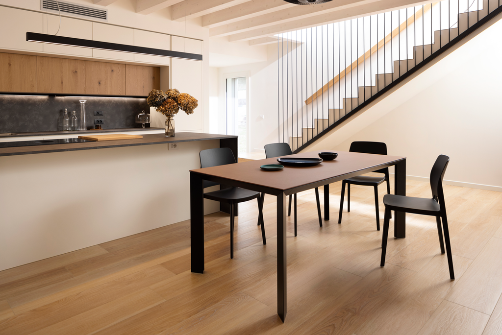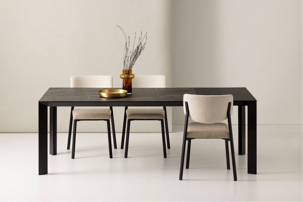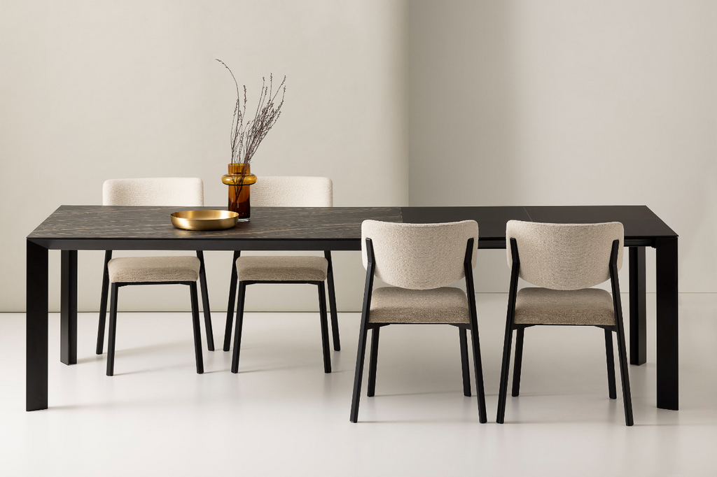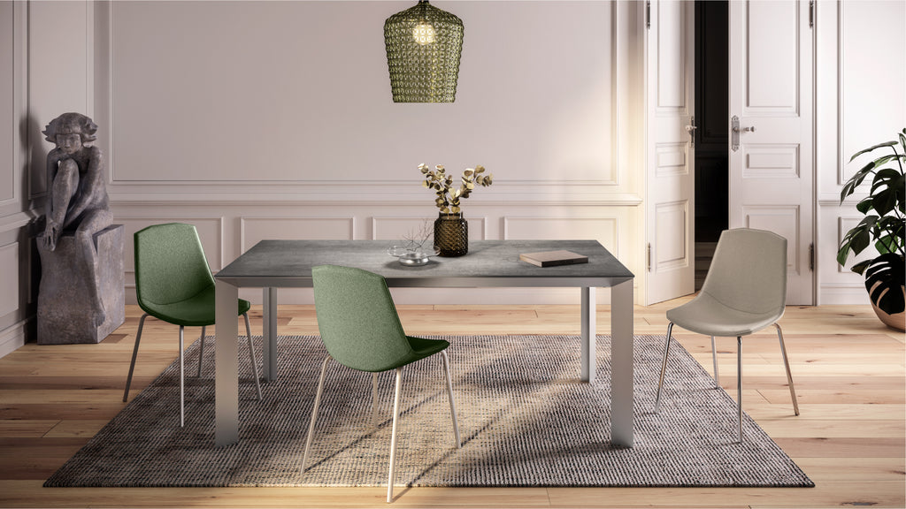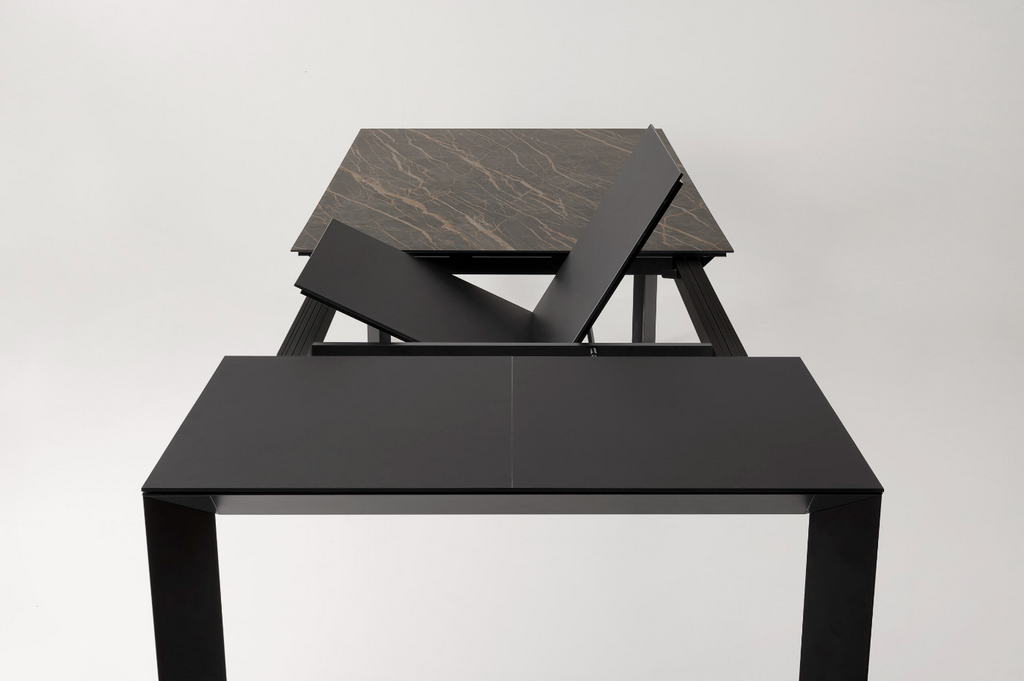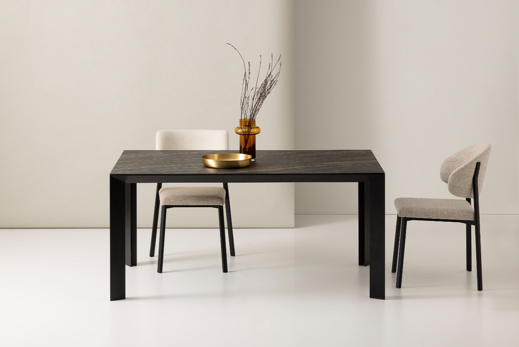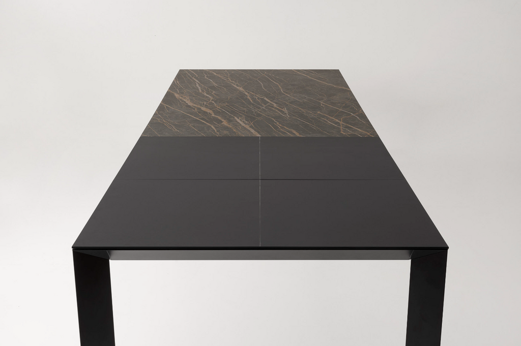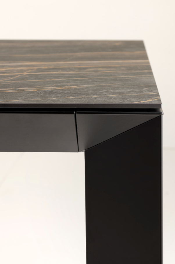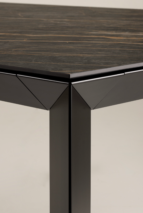 The design of the legs is the true signature of the Diamante table. It is reminiscent of the silhouette of a cut diamond, with a fascinating visual effect: the thin lines capture the light in a unique way, creating plays of shadows that add a touch of dynamism to the entire space.