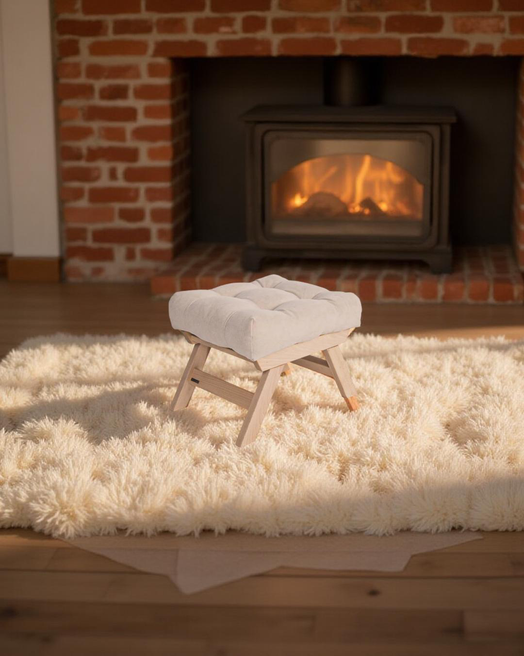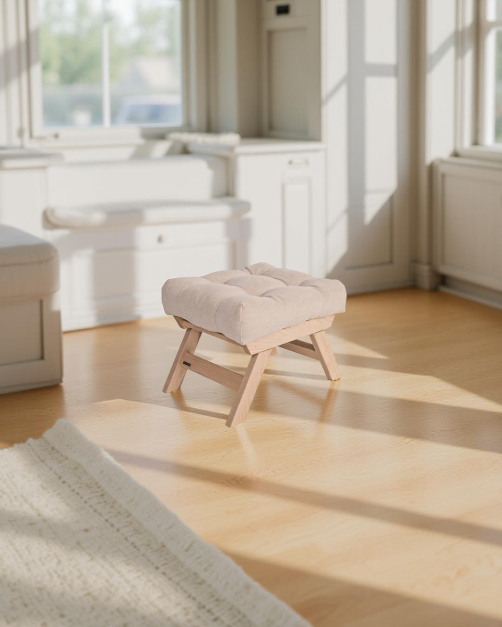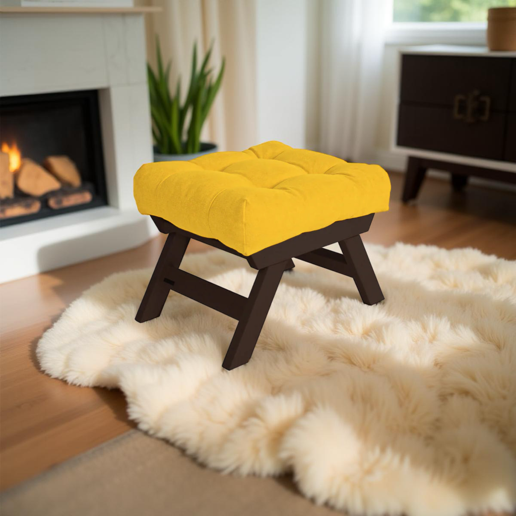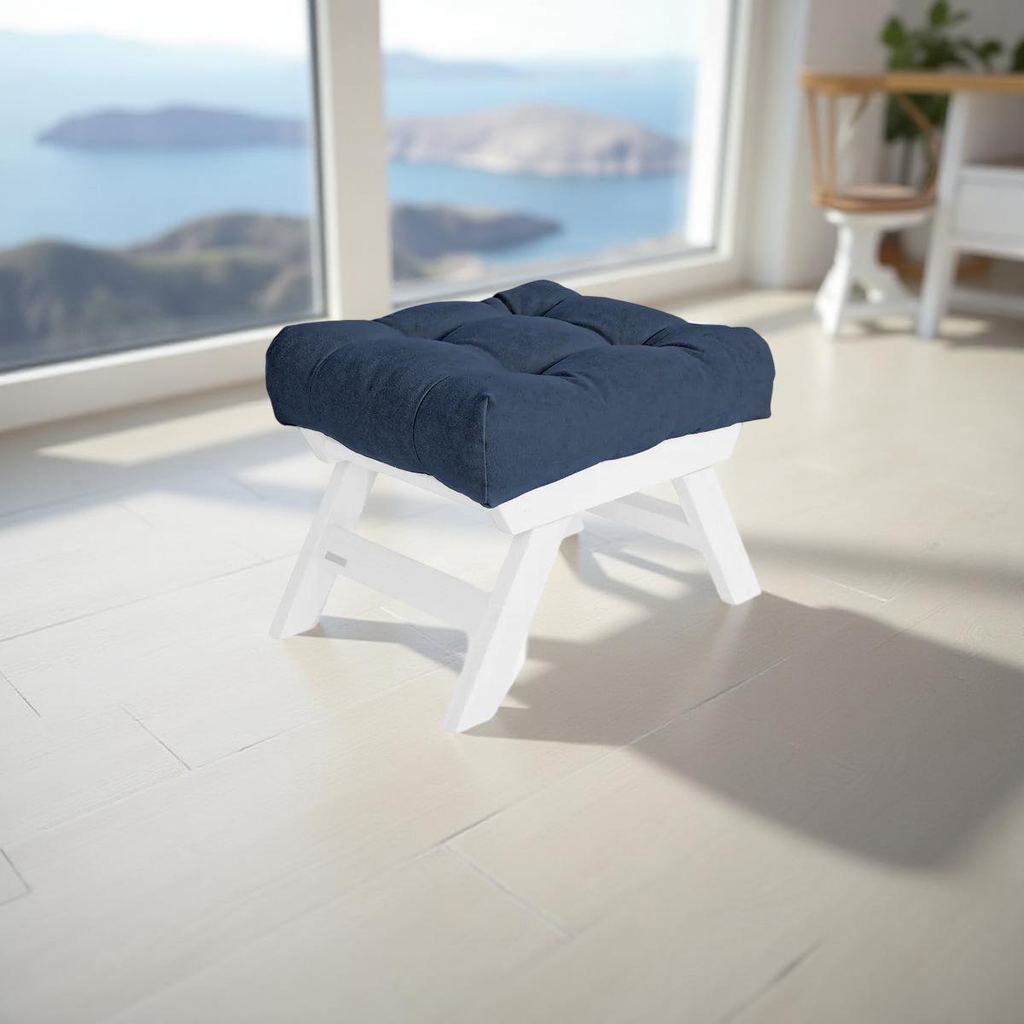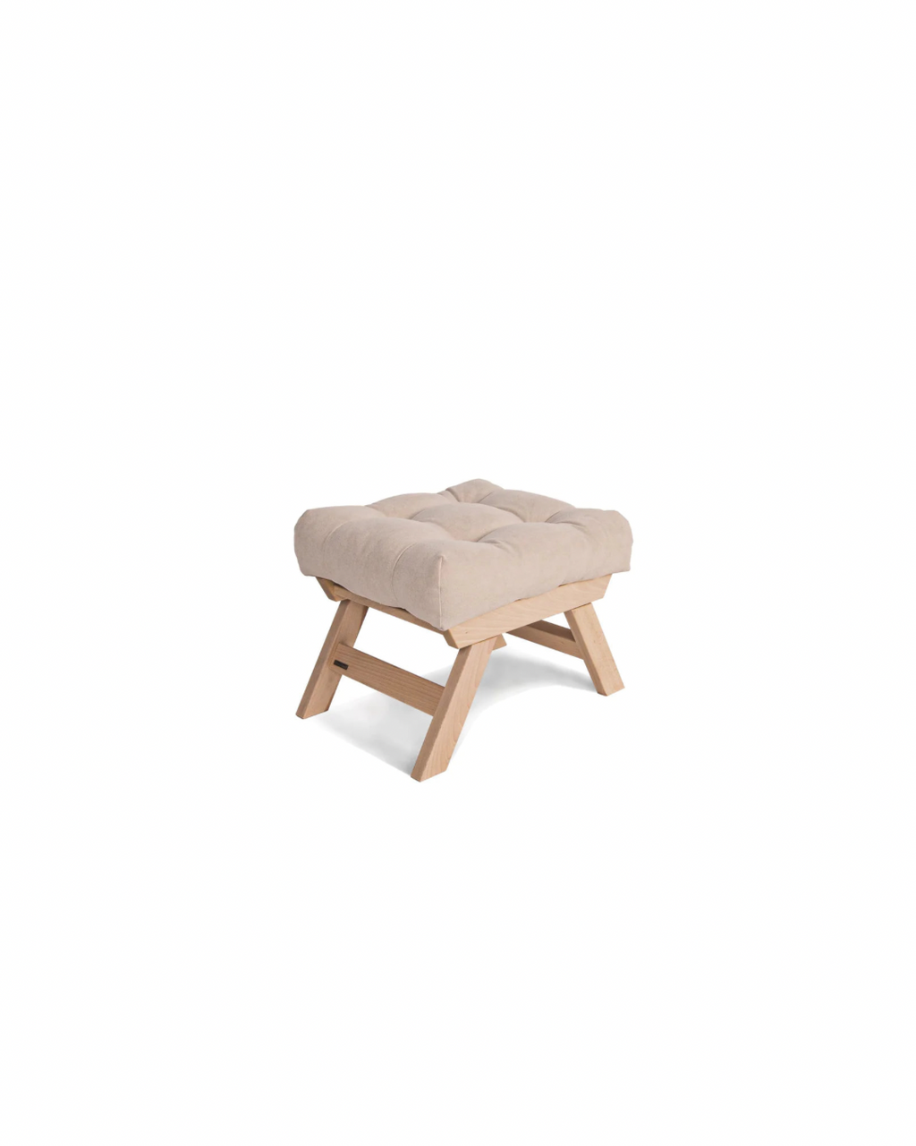 Stool with pouf seat with beech frame. Produced in 5 wood shades. In a variety of 10 fabrics of your choice.