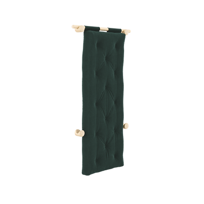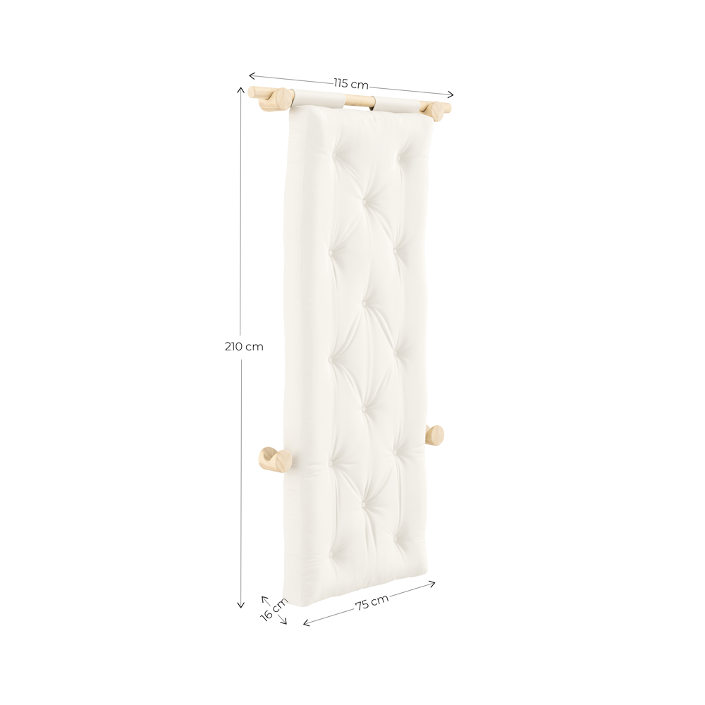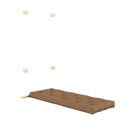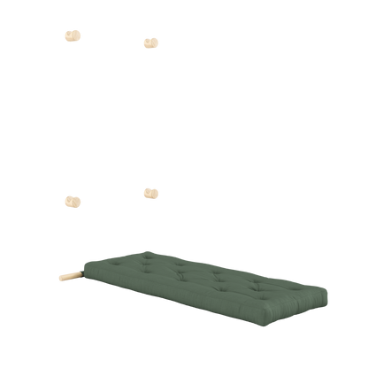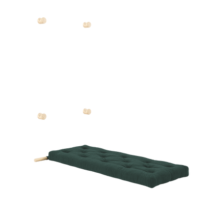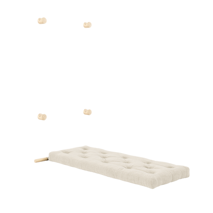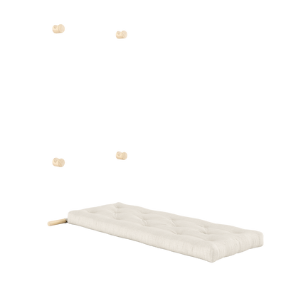 Four wall-mounted brackets keep Hooked securely in place, while allowing it to act as a decorative feature in the room when stored. When you need a seat, simply slide it into the lower position for a comfortable lounge setting. Ready to sleep? Simply unfold the mattress onto the floor – and you’ve got a comfortable bed ready in seconds.