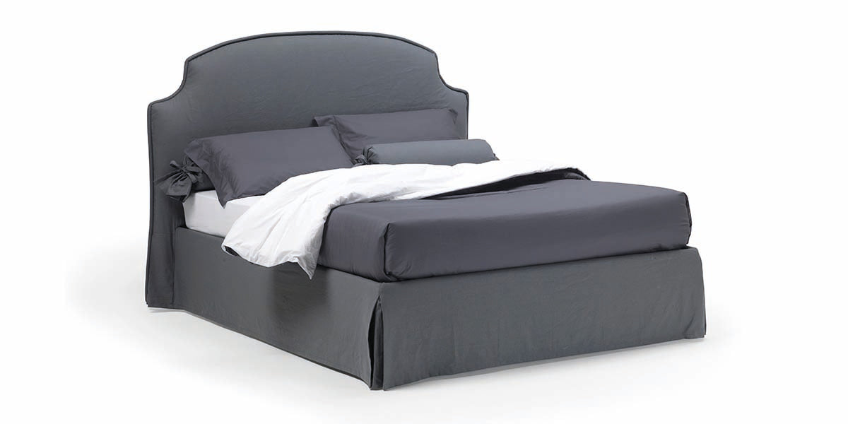 Shabby chic design, classic headboard. Removable cover. Available in a variety of eco-leather fabrics. The price includes a stand with storage space.