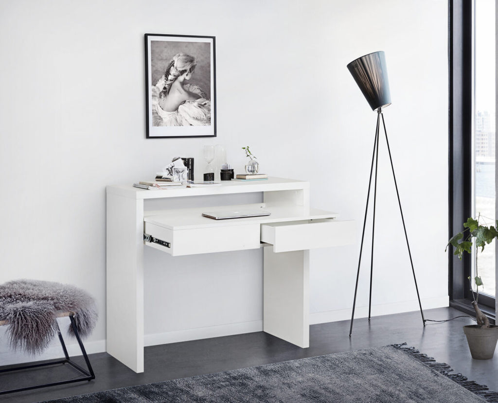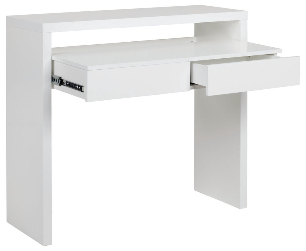 The desk is made of white MFC (crystal) board and MDF, glossy 15. Drawers moving by BLUM metal roller rails. Extendable worktop moves with metal telescopic rails. When the pull-out worktop is pulled out, then the depth of the product will be 56 (cm).