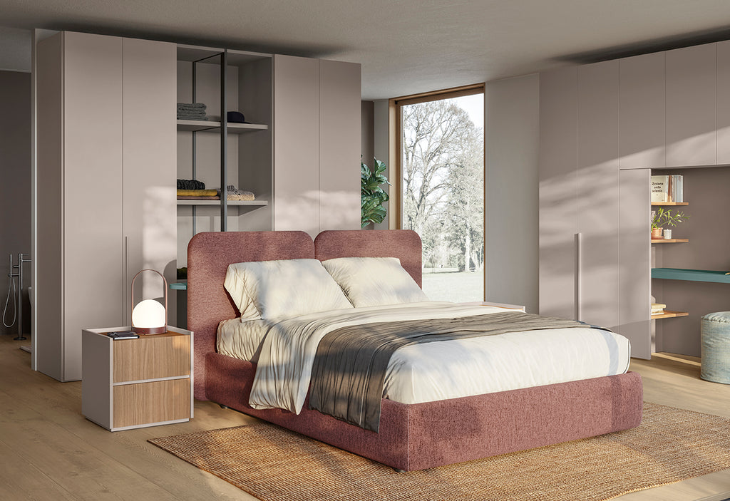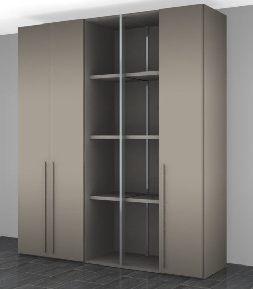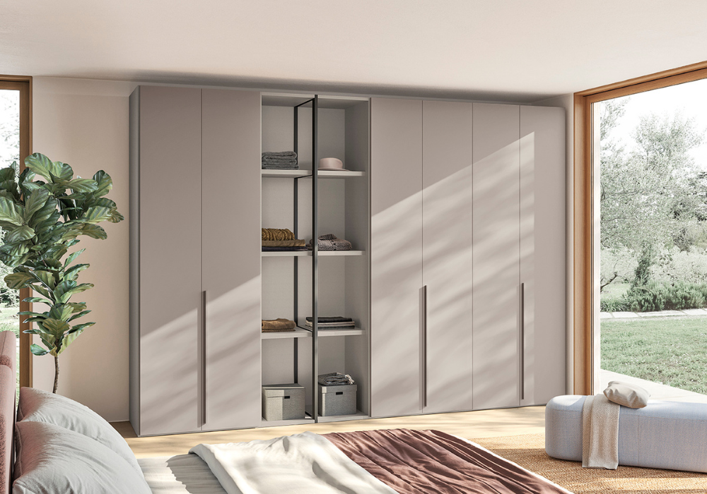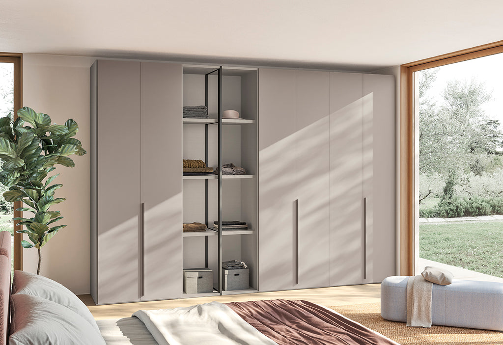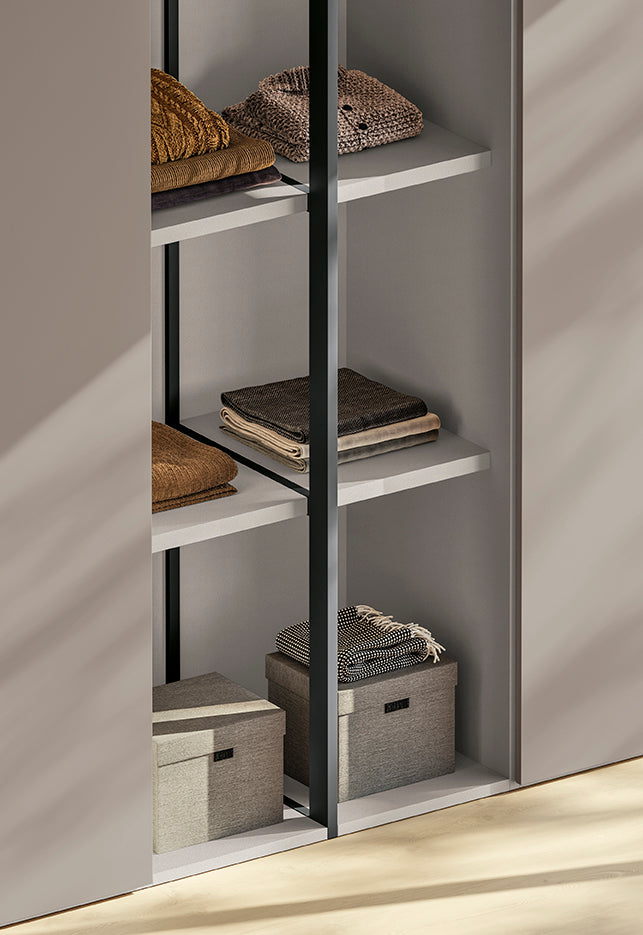 The P12 wardrobe from the Italian House Colombini Casa has opening doors and the metallic side panel in Carbon Grey makes the wardrobe distinctive and airy.