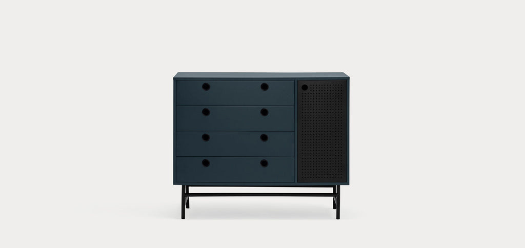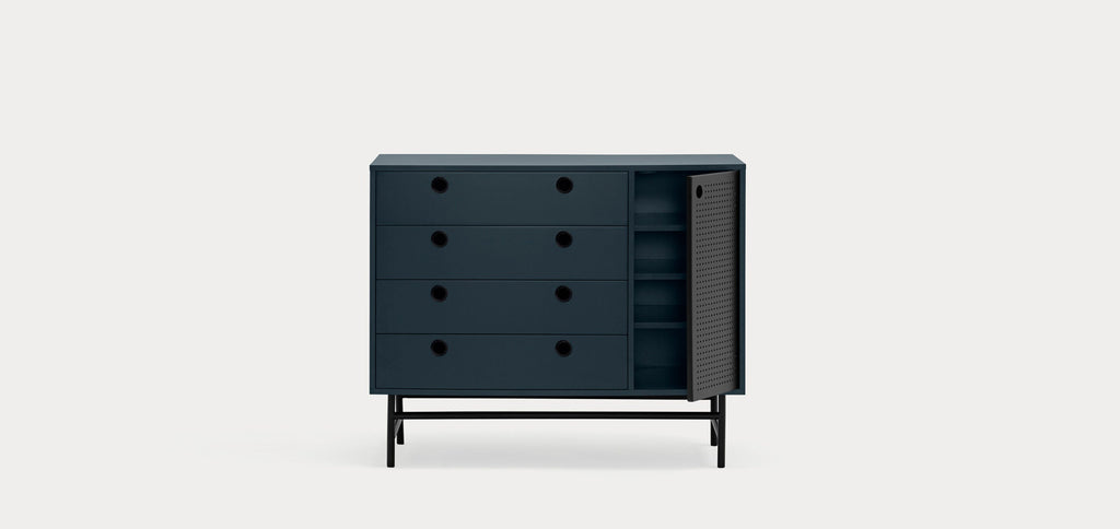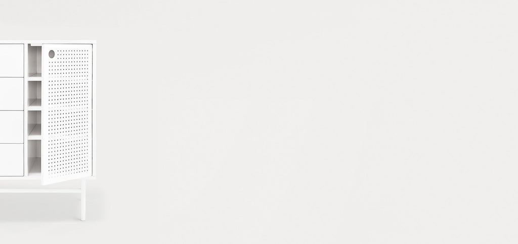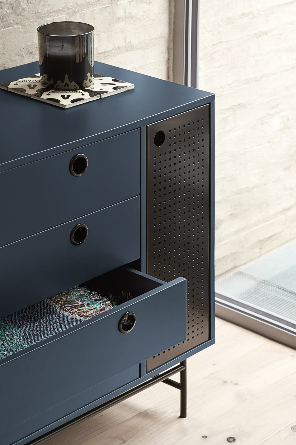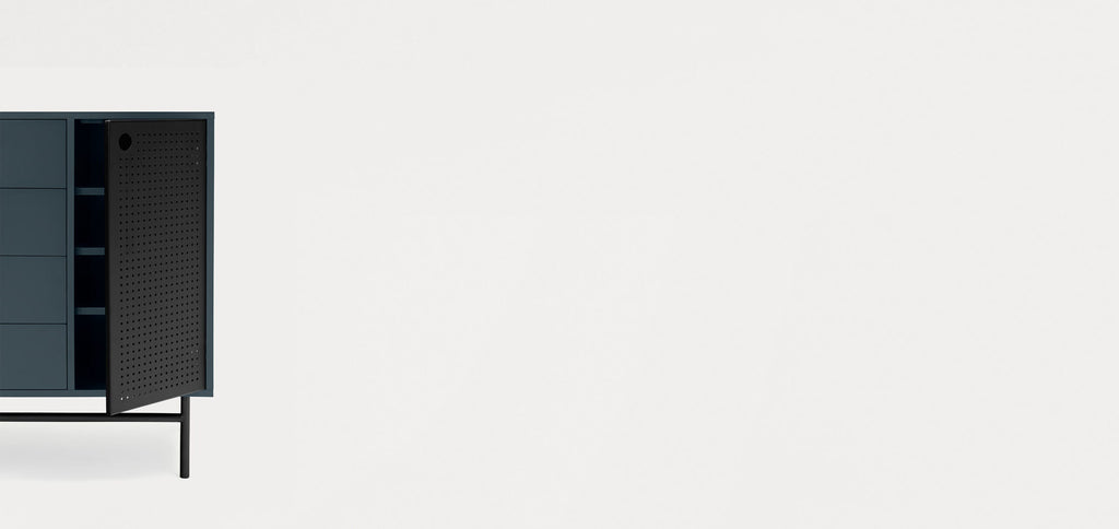 Punto collection claims its industrial spirit by combining design and functionality. The perforated metallic doors add to its singular character and personality.