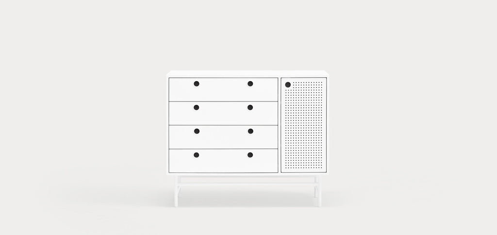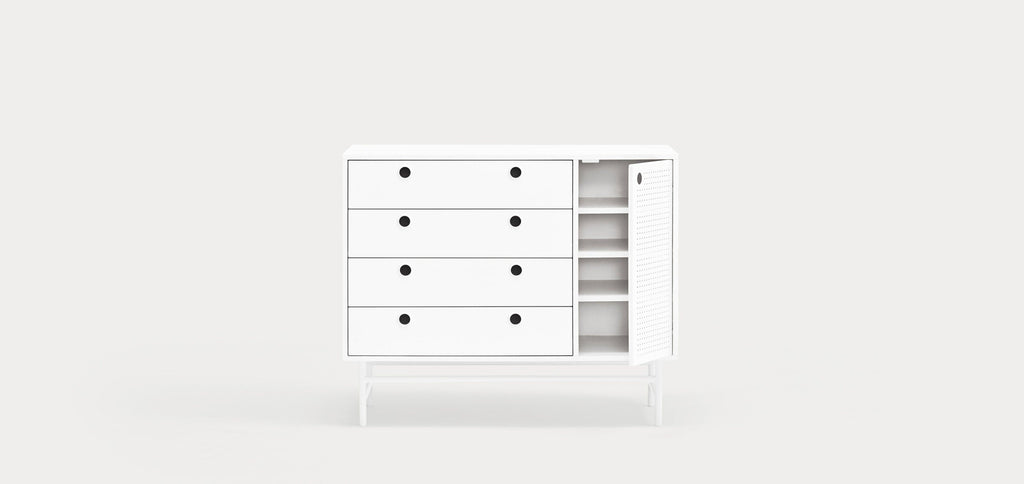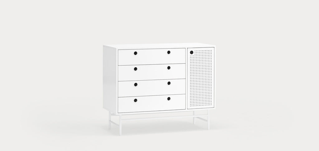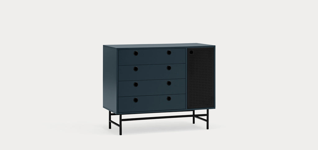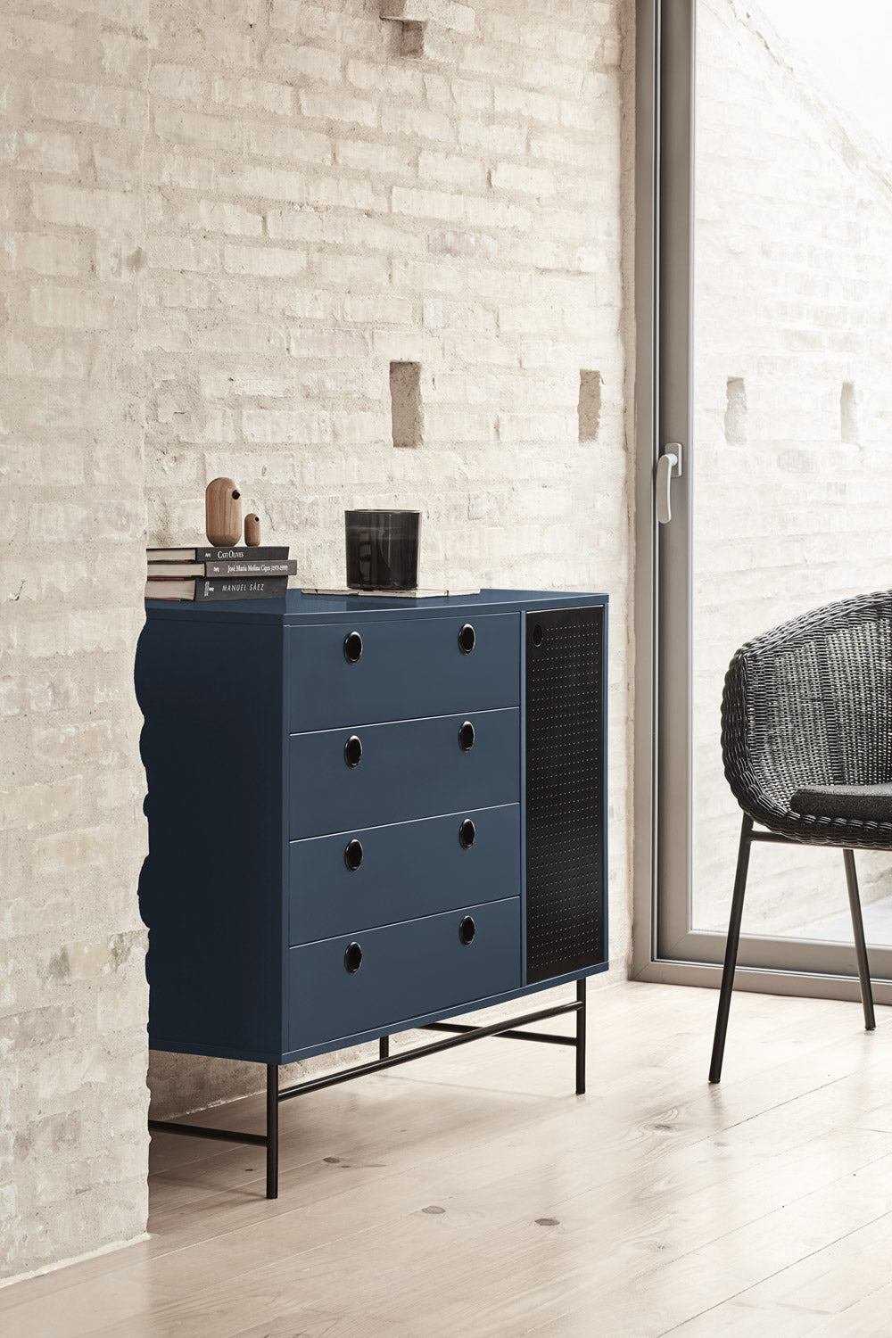 Punto collection claims its industrial spirit by combining design and functionality. The perforated metallic doors add to its singular character and personality.