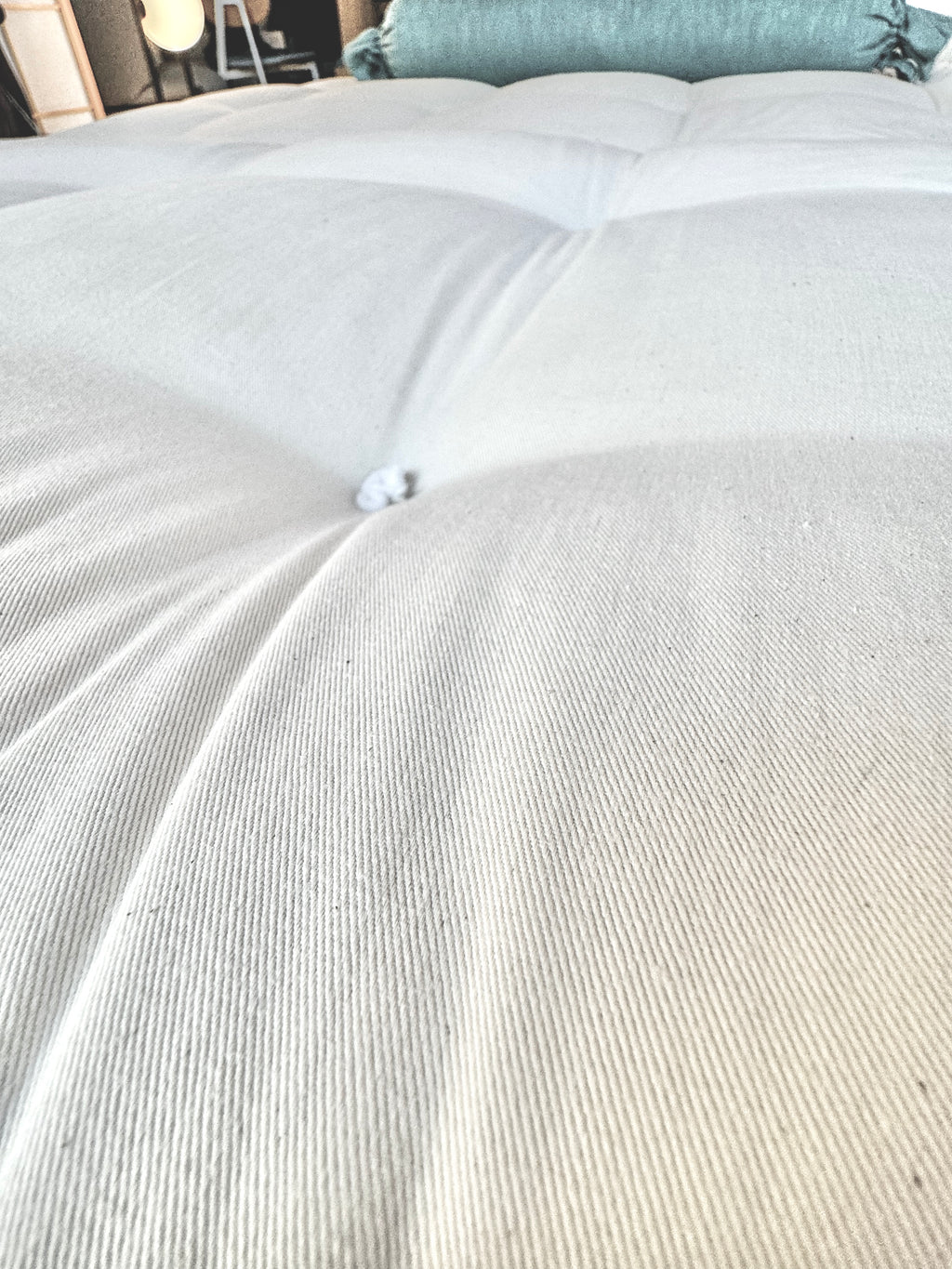 The cover is made of 100% natural cotton fabric , which ensures proper airflow in the futon. The futon is hand -quilted and finished with white felt.