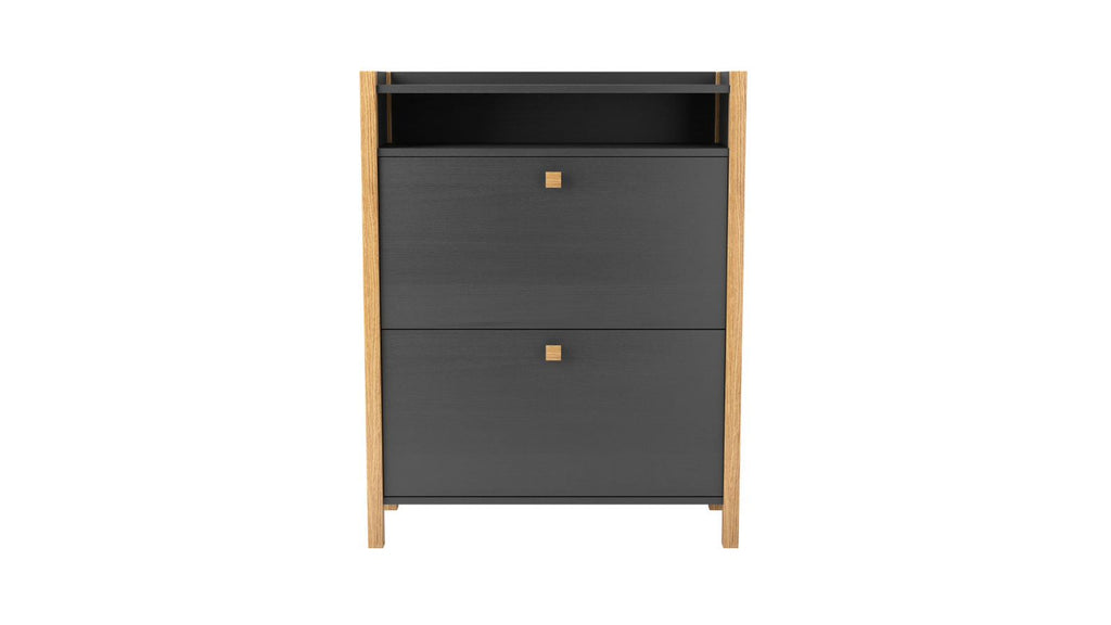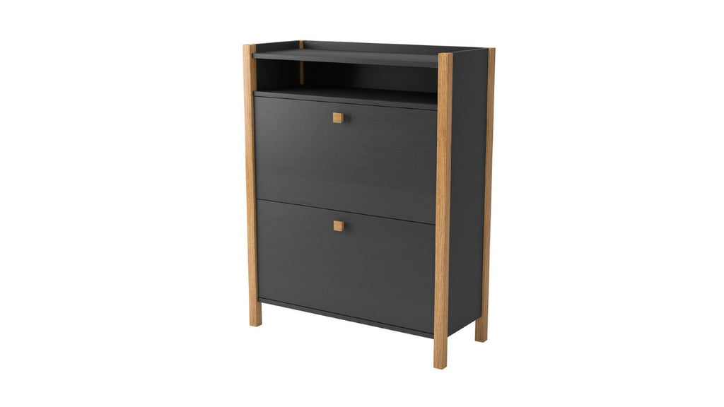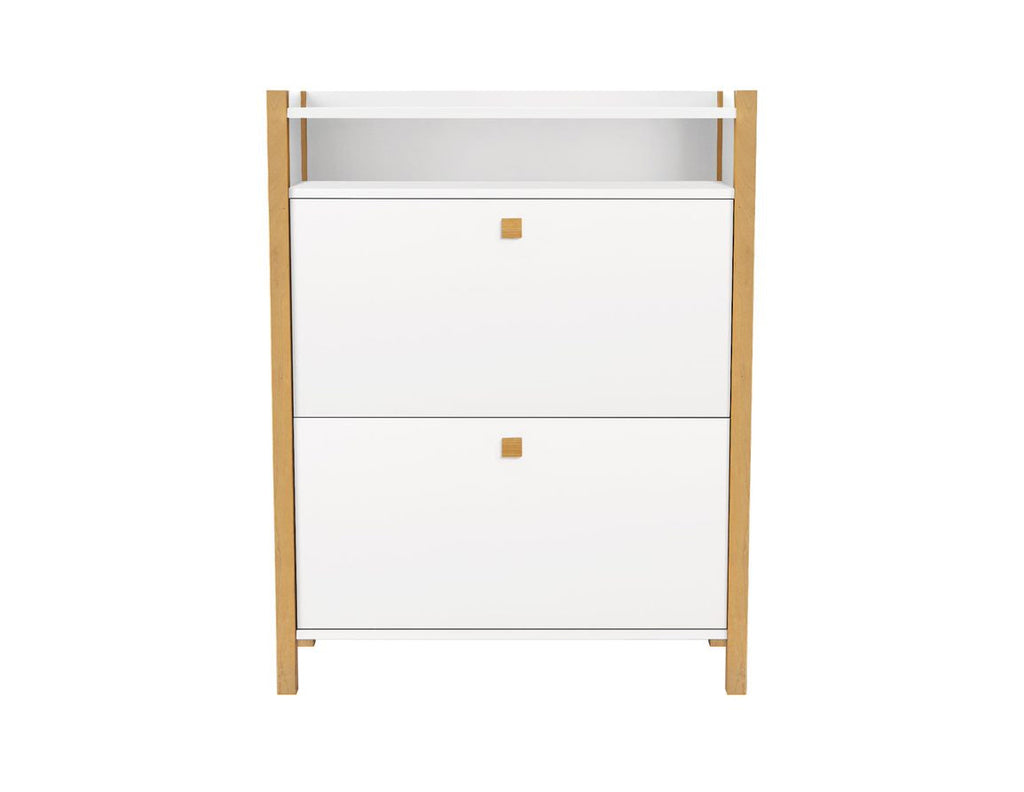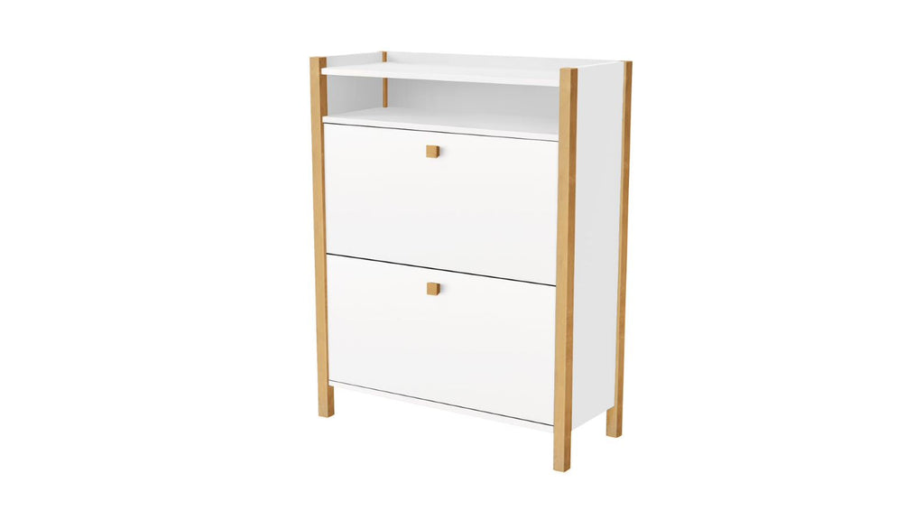 Shoe cabinet with open shelf and 2 doors. The cabinet is made of white chipboard with melamine. Solid birch corner pieces and corner door knobs (35x35mm), covered with clear varnish.