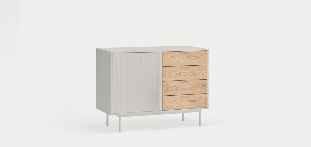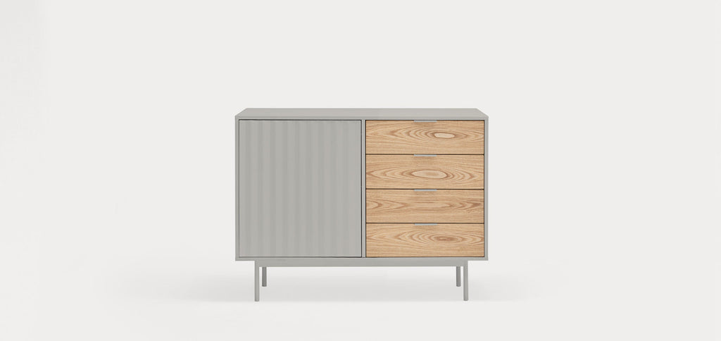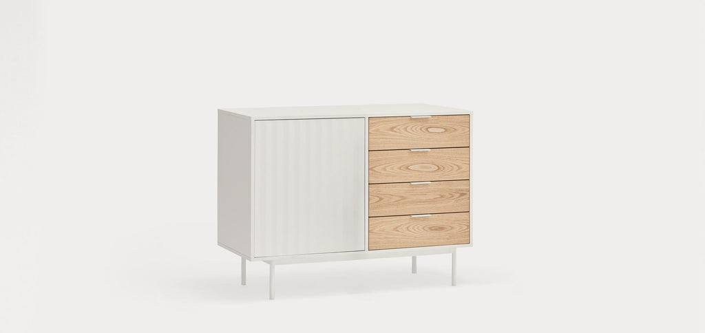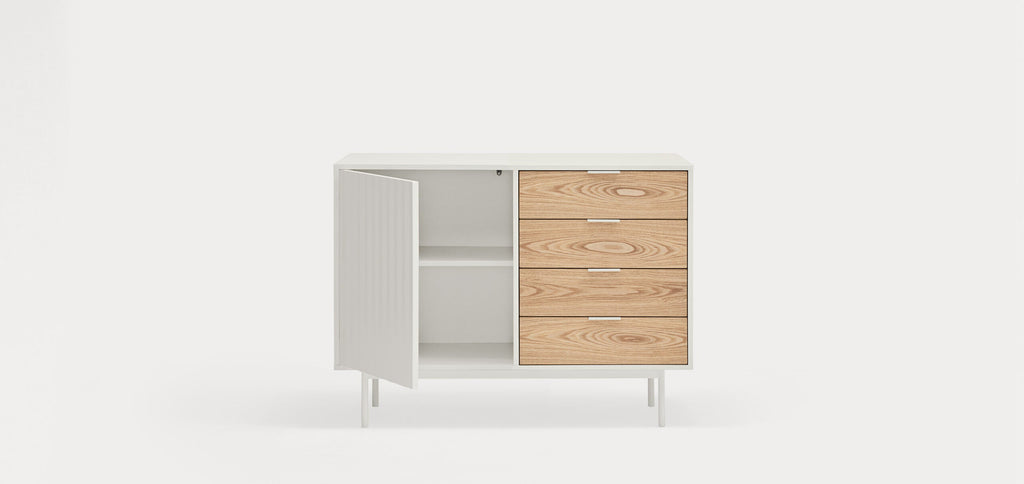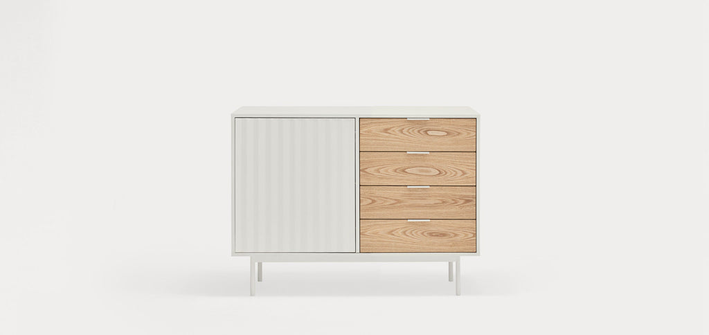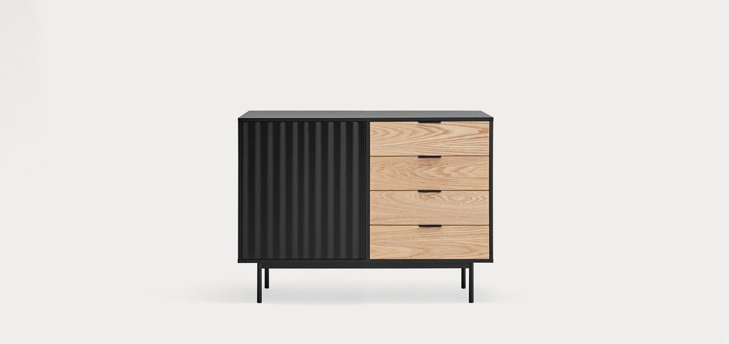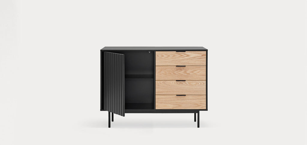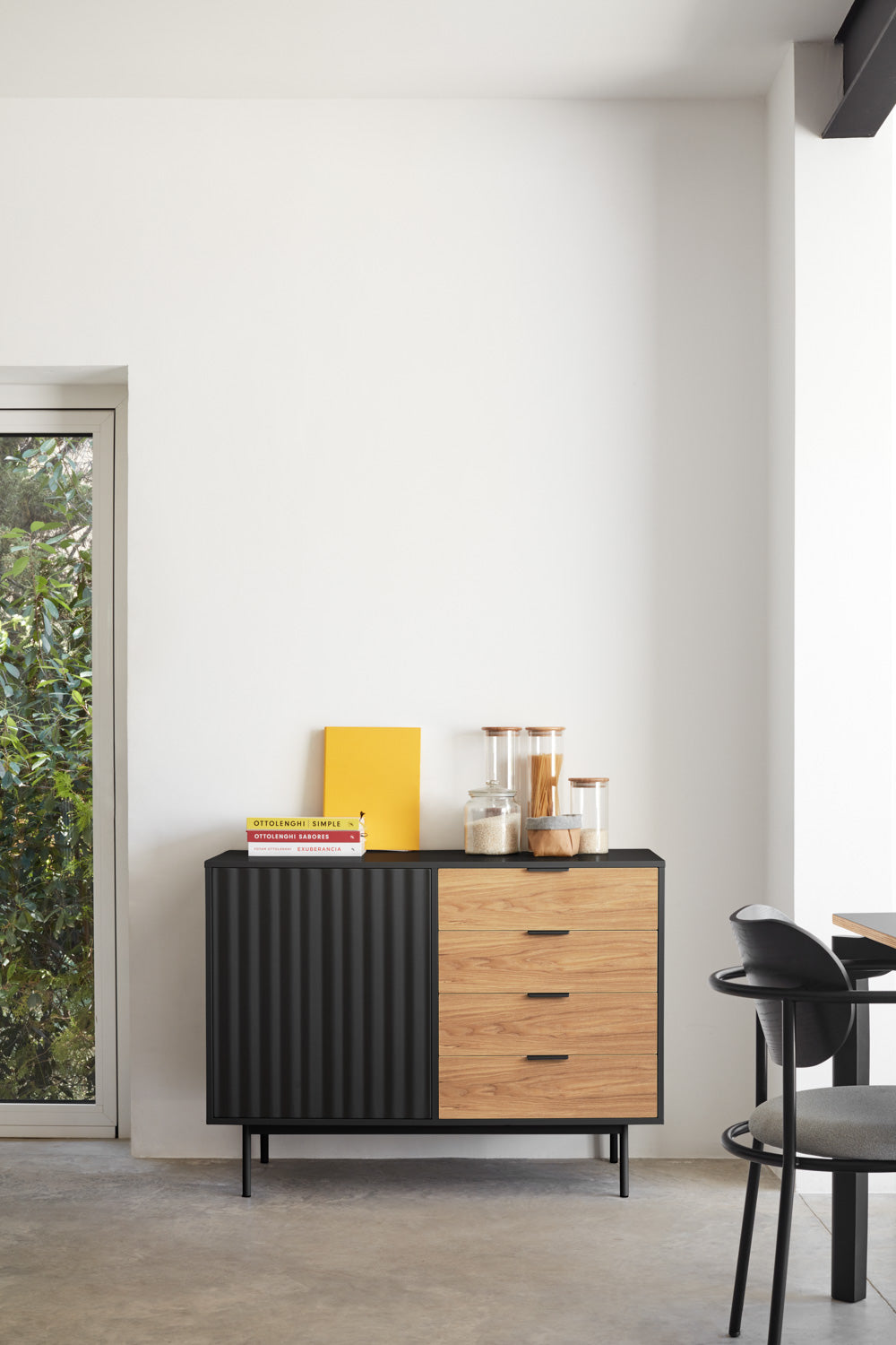 The sideboard has two serrated doors and four drawers in natural wood veneer for organizing the storage space.