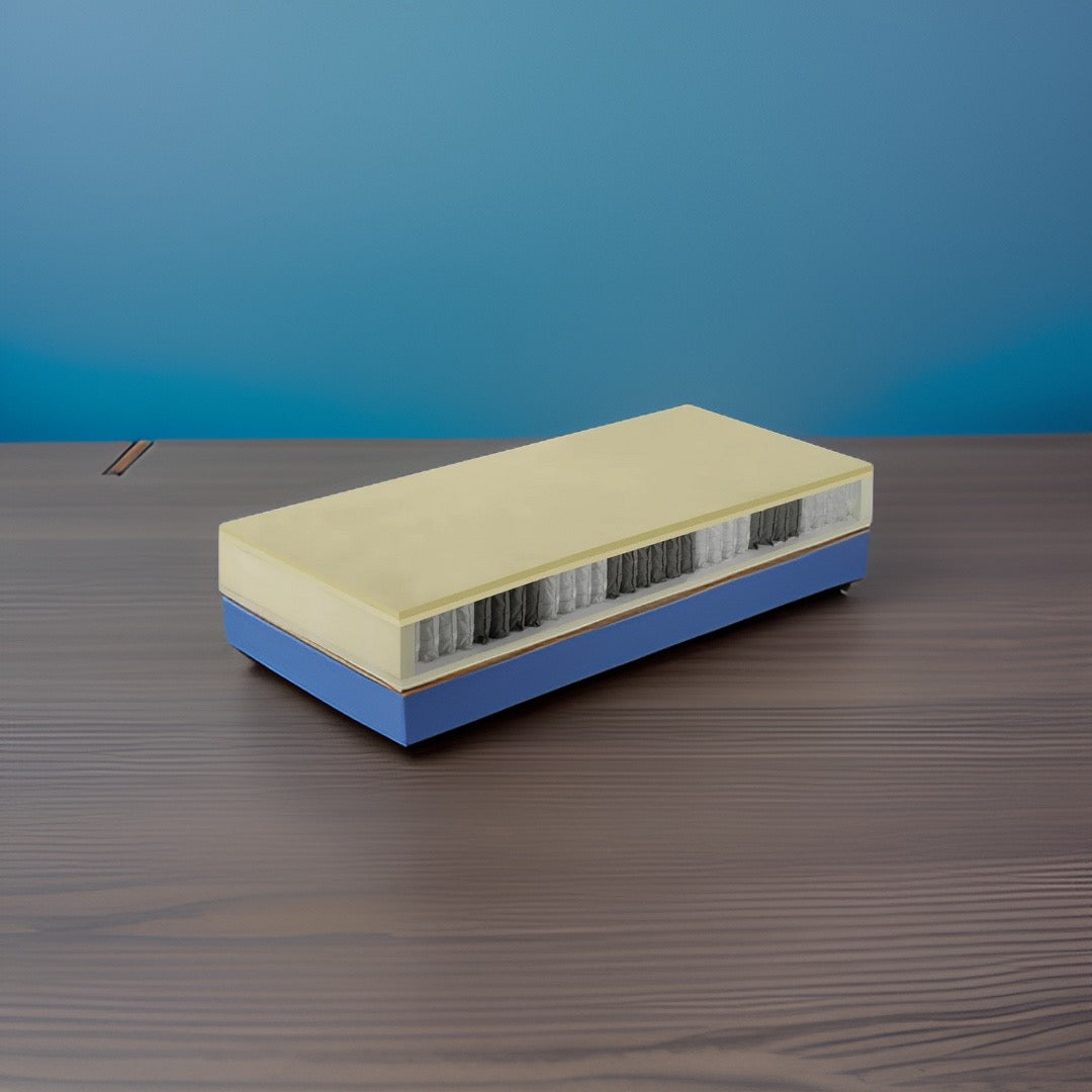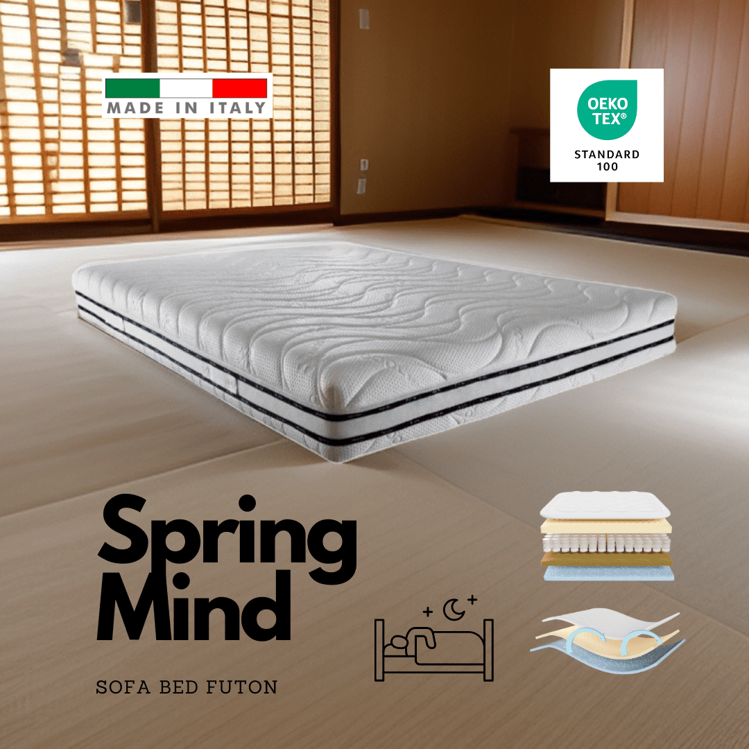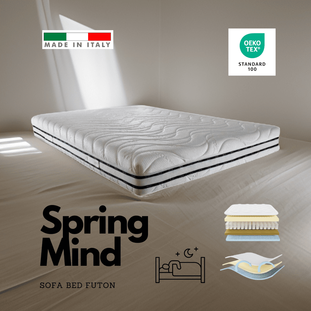 The mattress has a core of independent springs. Each independent spring is individually stimulated by the weight of the body and guarantees a perfect welcome in each area. The Spring Mind mattress has 900 pocket springs in the single size and 1800 in the 160cm size. The mattress adapts perfectly to the body and contributes to the natural alignment of the spine for ergonomic support.