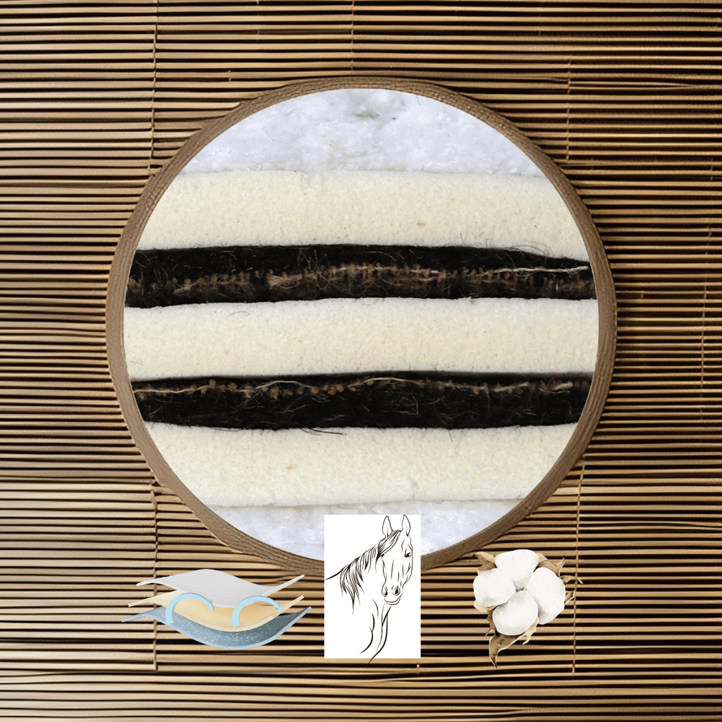 Our Triple latex futon is an 18 cm thick cotton and wool bed mattress with a latex foam core and horsehair, inheriting all the good qualities of a traditional Japanese futon. The Triple latex futon will give you a soft-medium firm sleeping surface. The cotton in the futon will adapt to your body and support it, the wool helps create a good climate, the latex will isolate any movement while the horsehair insulates from the cold and at the same time channels heat and moisture away.