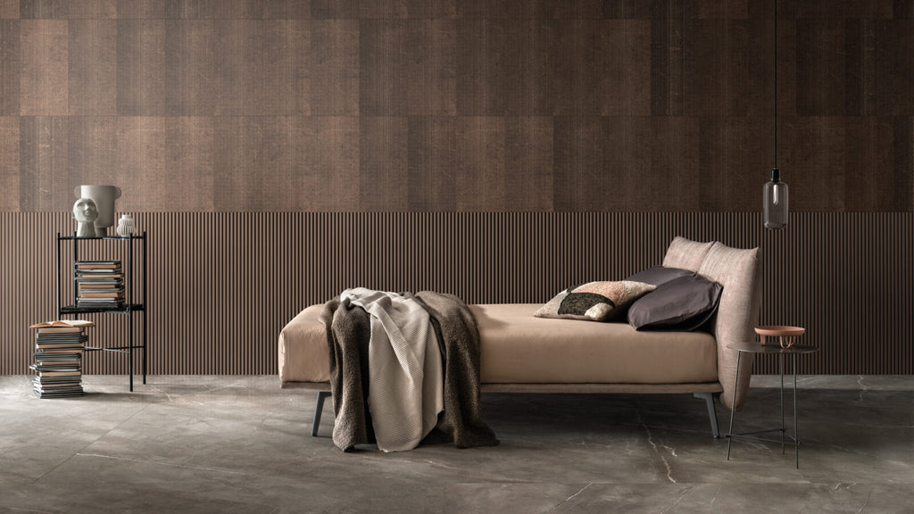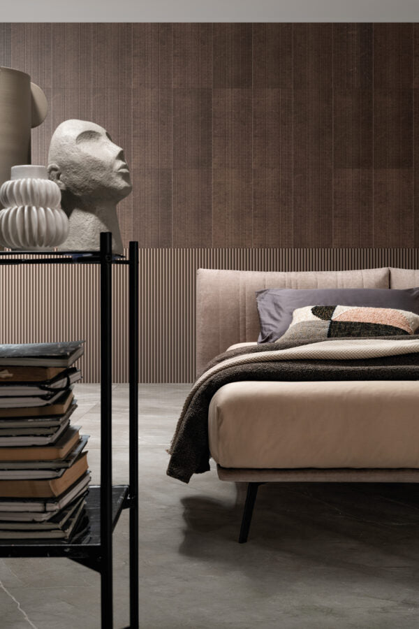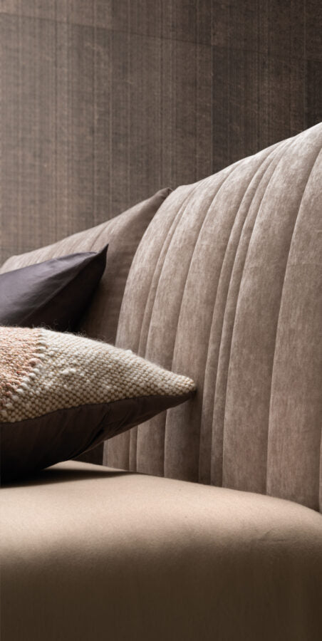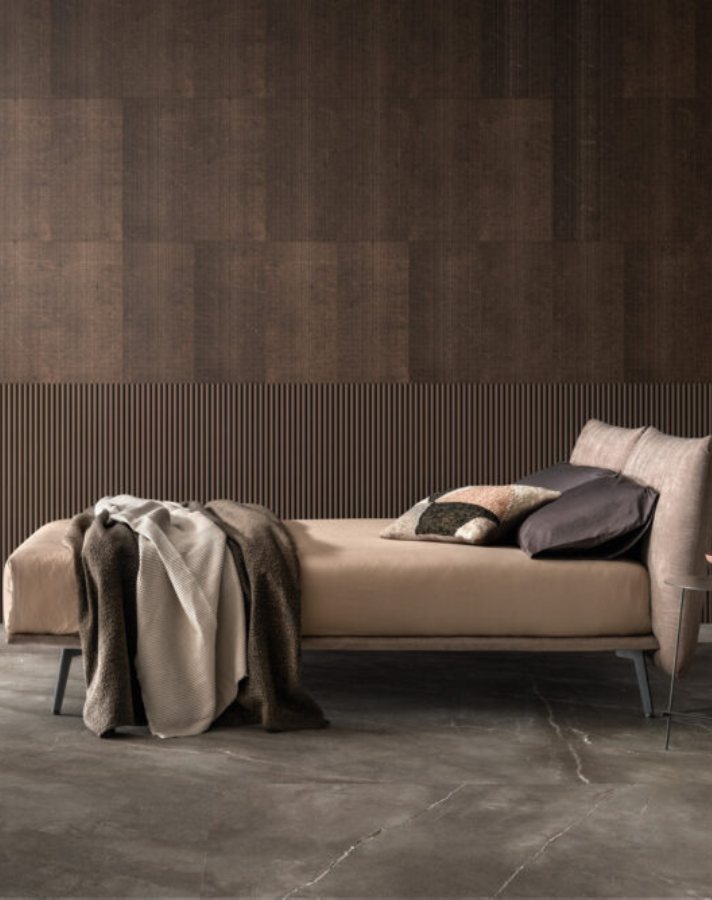 The Warp upholstered bed has two large and generous cushions with vertical stitching. It is also captivating for its visual lightness due to the reduced thickness of the frame. Available in a variety of fabrics and variations.