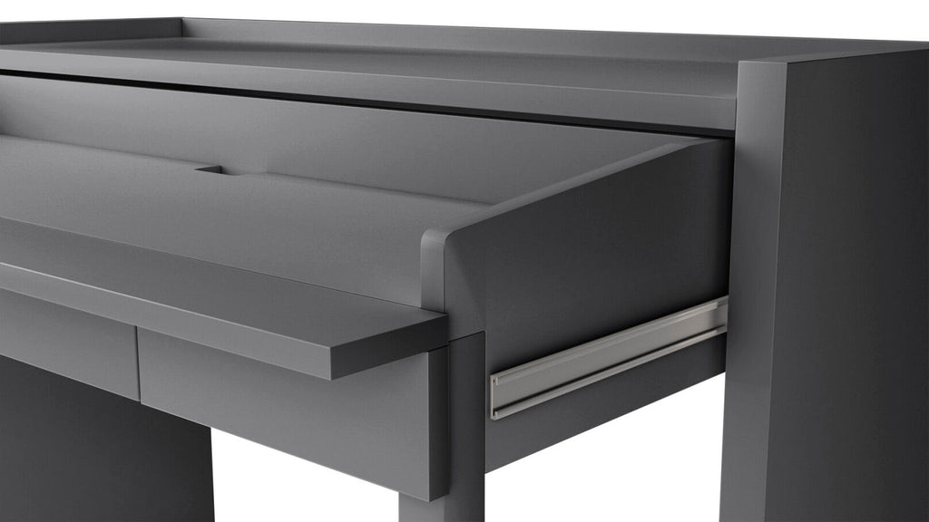 Το γραφείο είναι κατασκευασμένο από σανίδα MFC και MDF, η οποία είναι βαμμένη σε λευκό (Ral 9003) , γυαλάδα 20%. Τα μπροστινά πόδια είναι κατασκευασμένα από μασίφ οξιά, τα οποία είναι βαμμένα με λευκό χρώμα. Συρτάρι που κινείται με μεταλλικές ράγες. Επεκτάσιμες κινήσεις επιφάνειας εργασίας με μεταλλικές τηλεσκοπικές ράγες. Στο τέλος των μπροστινών ποδιών υπάρχουν πλαστικοί τροχοί για εύκολη μεγέθυνση του τραπεζιού.