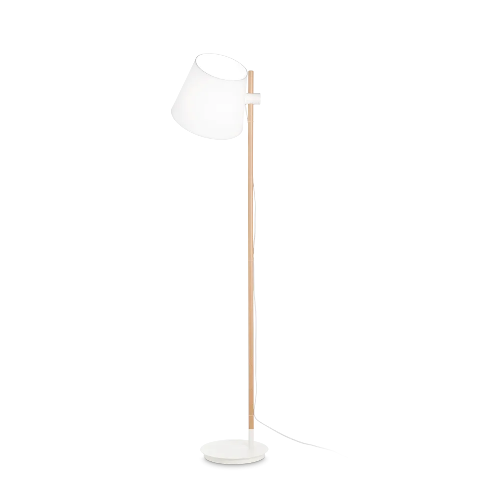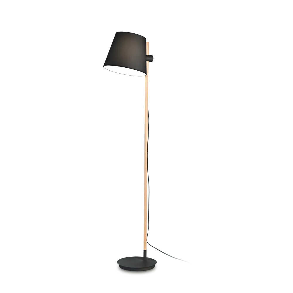 Βάση και εξαρτήματα από μέταλλο με βαφή πούδρας. Στέλεχος από φυσικό ξύλο. Ρυθμιζόμενο ύψος αμπαζούρ, από PVC ντυμένο με ύφασμα. Καλώδιο PVC με διακόπτη.