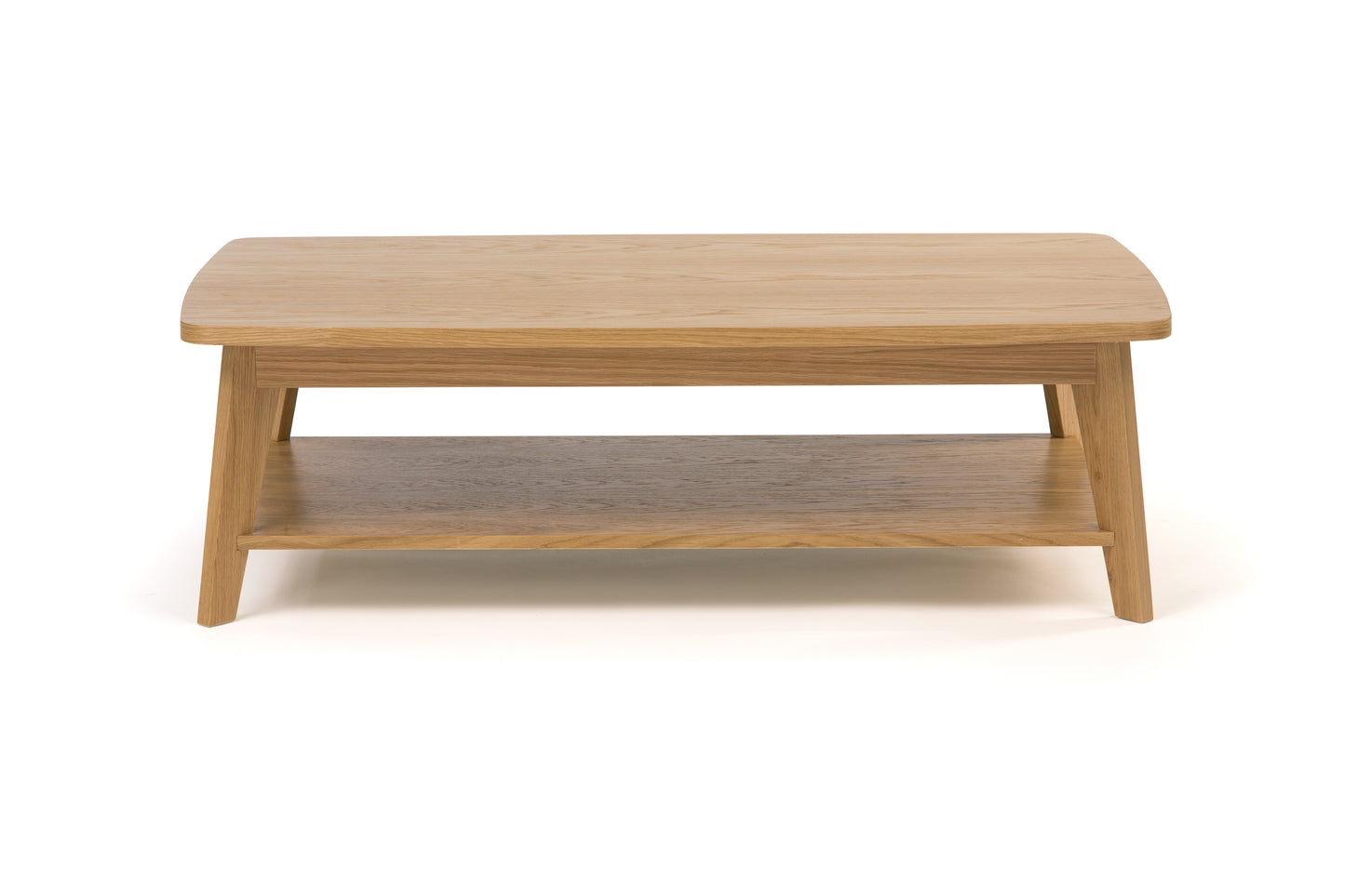 Τραπεζάκι σαλονιού 2 επιπέδων. Μασίφ πόδια δρυός, βάση από κόντρα πλακέ με καπλαμά. Επάνω μέρος από μοριοσανίδες από καπλαμά δρυός (PLP22) με διακριτικά καμπύλες γωνίες. Ράφι από μοριοσανίδα 16mm (PLP16). Όλα καλυμμένα με διαφανές βερνίκι.