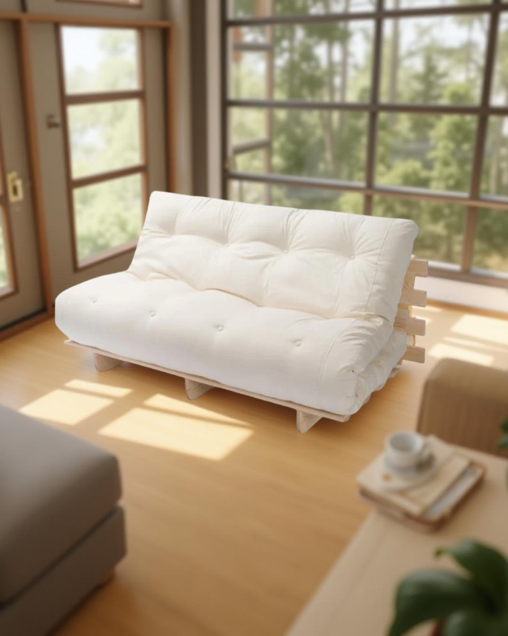 Καναπές φουτόν, που μετατρέπεται πολύ εύκολα, μετακινώντας την πλάτη προς τα πίσω, σε ένα άνετο διπλό κρεβάτι. Με χειροποίητο στρώμα futon. Έτσι, έχετε ένα Ιαπωνικό κρεβάτι πλατφόρμα για εσάς ή για τους φιλοξενούμενούς σας!