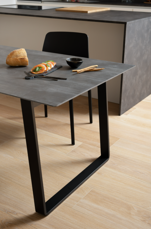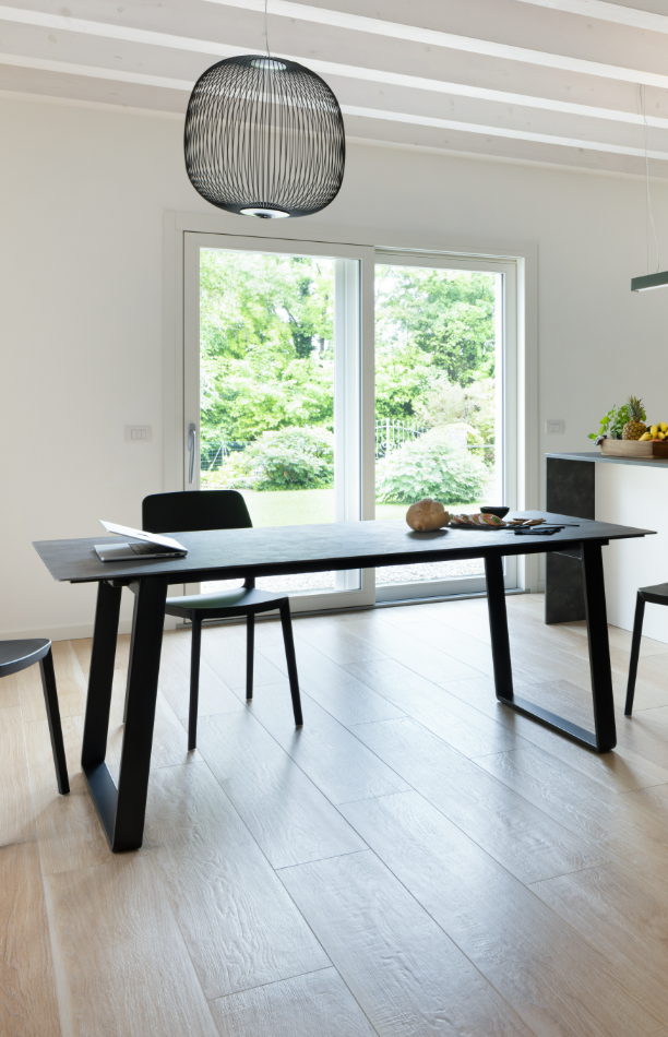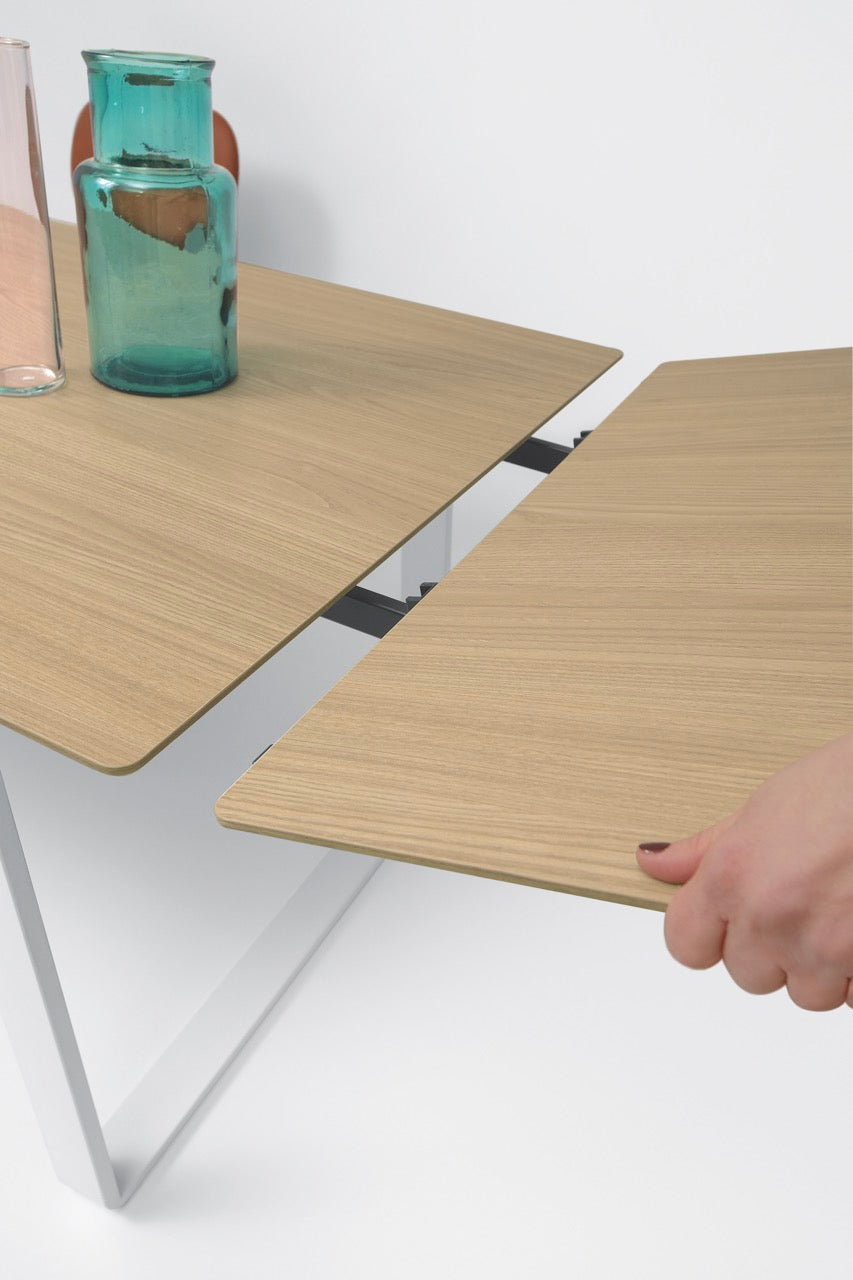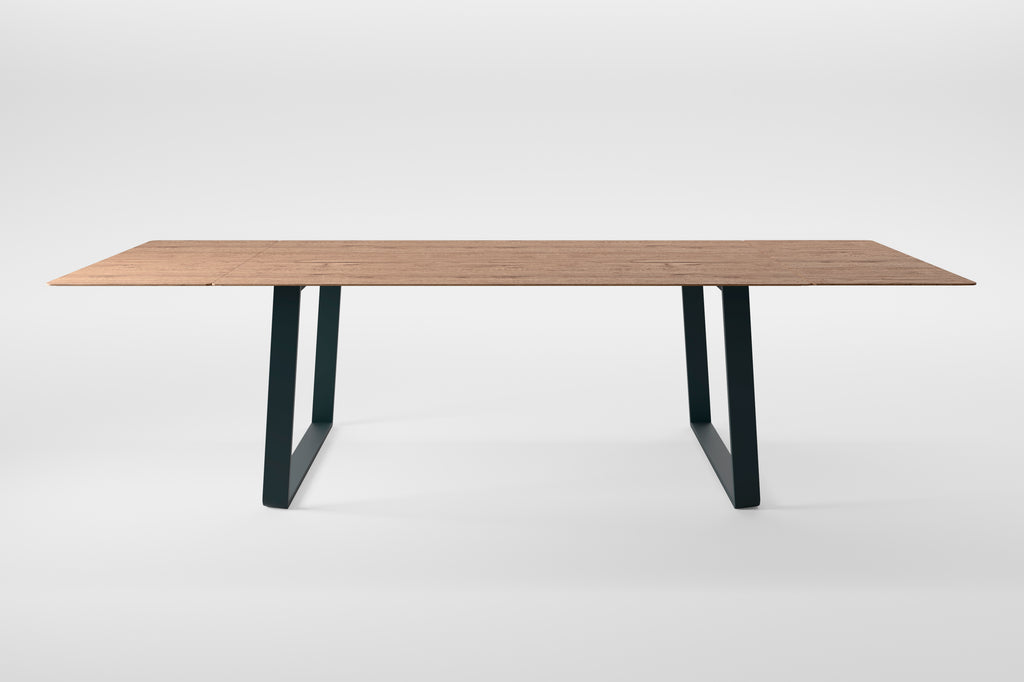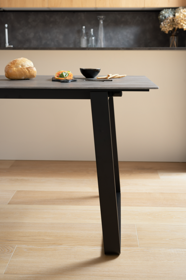 Οι καθαρές γραμμές του τραπεζιού ενισχύονται από τα ελαφρώς κεκλιμένα πόδια, λυγισμένα με την τεχνική «αναδίπλωσης». Χάρη στο σύστημα ανοίγματος με τους αναδιπλούμενους οδηγούς και το ασφαλές σύστημα αγκίστρωσης, το τραπέζι είναι πρακτικό και εύκολο στο χειρισμό, ιδανικό για κάθε χώρο.