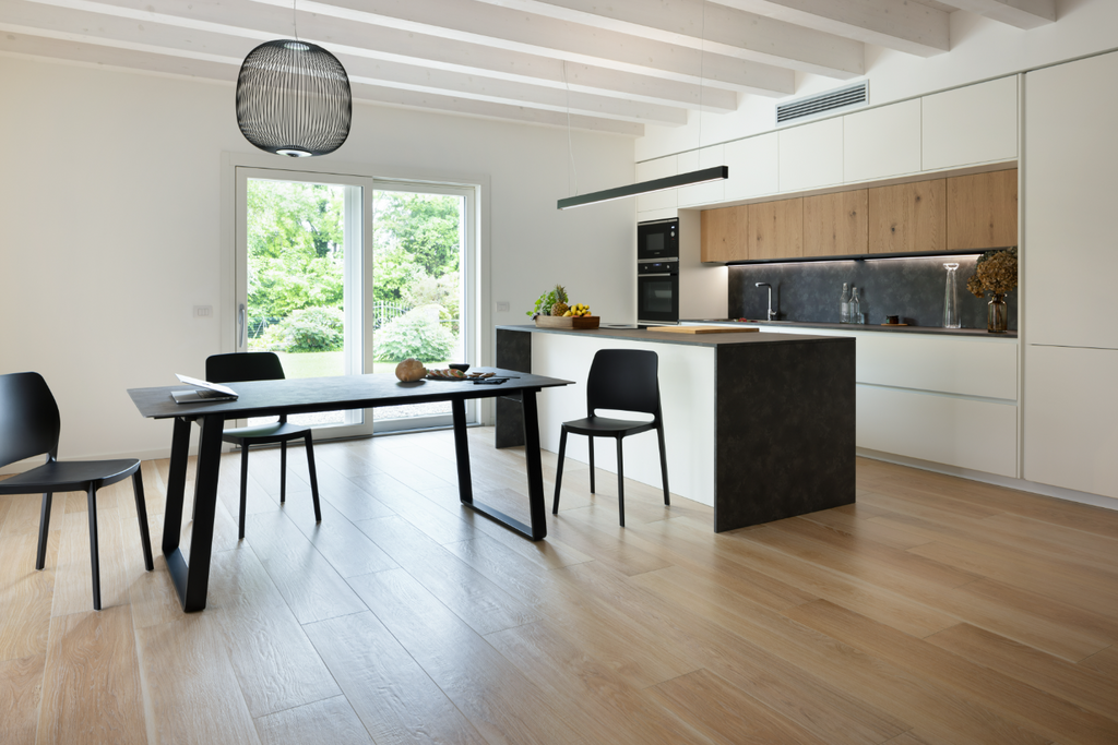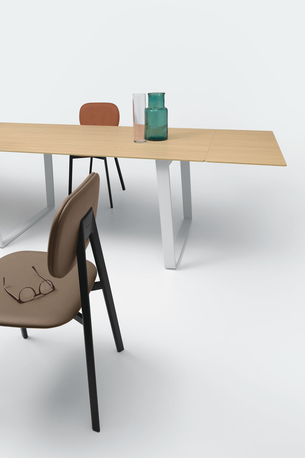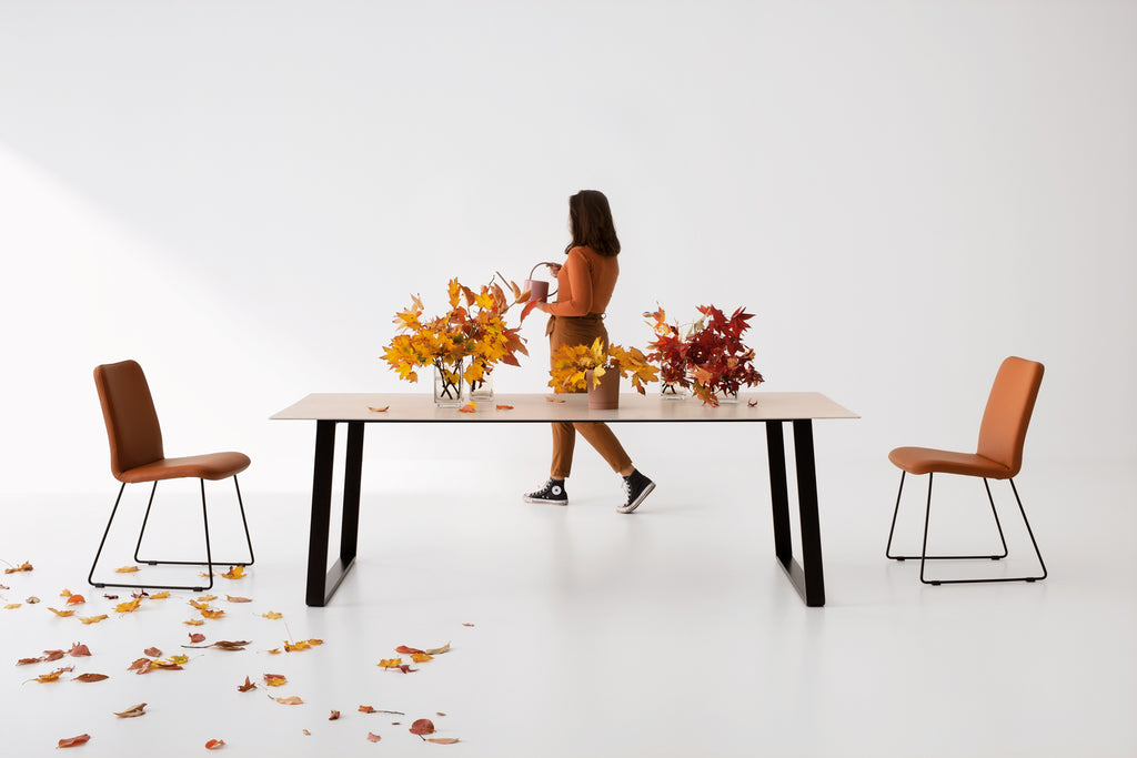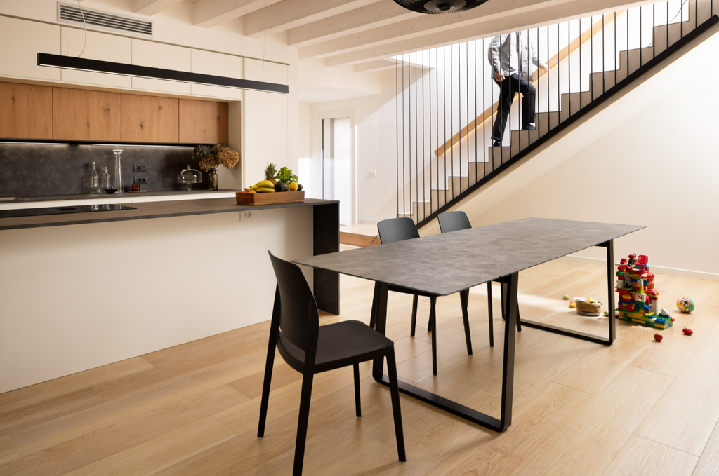 Οι καθαρές γραμμές του τραπεζιού ενισχύονται από τα ελαφρώς κεκλιμένα πόδια, λυγισμένα με την τεχνική «αναδίπλωσης». Χάρη στο σύστημα ανοίγματος με τους αναδιπλούμενους οδηγούς και το ασφαλές σύστημα αγκίστρωσης, το τραπέζι είναι πρακτικό και εύκολο στο χειρισμό, ιδανικό για κάθε χώρο.