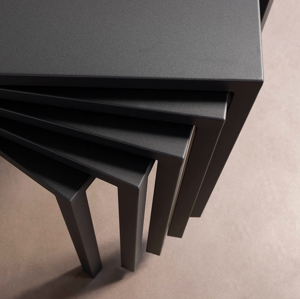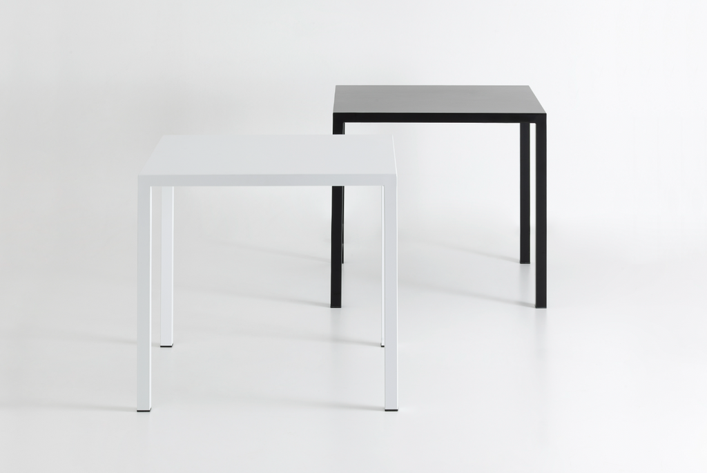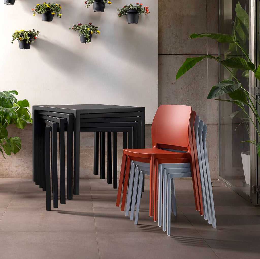 Στοιβαζόμενο τραπέζι Plana για εσωτερική/εξωτερική χρήση. Χαλύβδινη κατασκευή με 4 πόδια 4x4cm και λαμαρίνα με ρυθμιζόμενα πόδια για ευστάθεια και στα τέσσερα πόδια, εξαλείφοντας το ενοχλητικό πρόβλημα του λικνίσματος σε περίπτωση ανώμαλου δαπέδου.